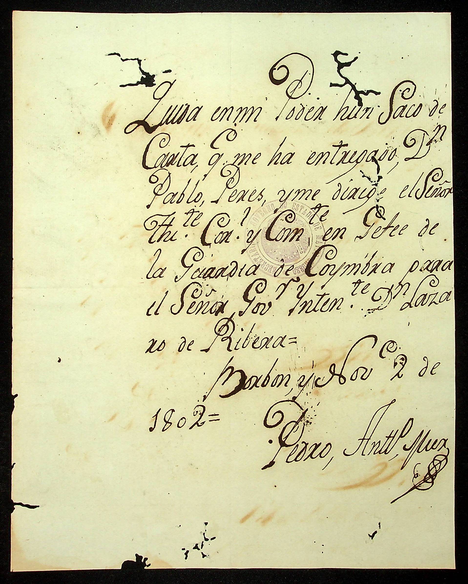 RECIBO do Comandante de Bourbon Pedro Antônio Miens à [Pablo Peres].