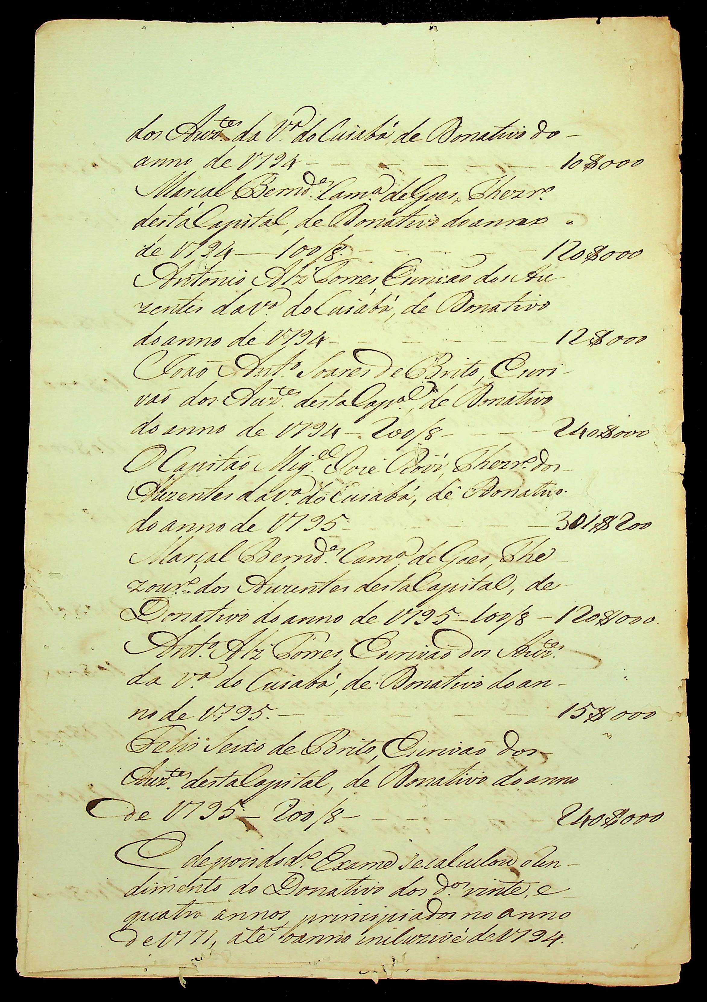 RELATÓRIO (cópia) dos rendimentos dos donativos dos ditos vinte e quatro anos principiados no ano de 1771 até o ano de 1794.