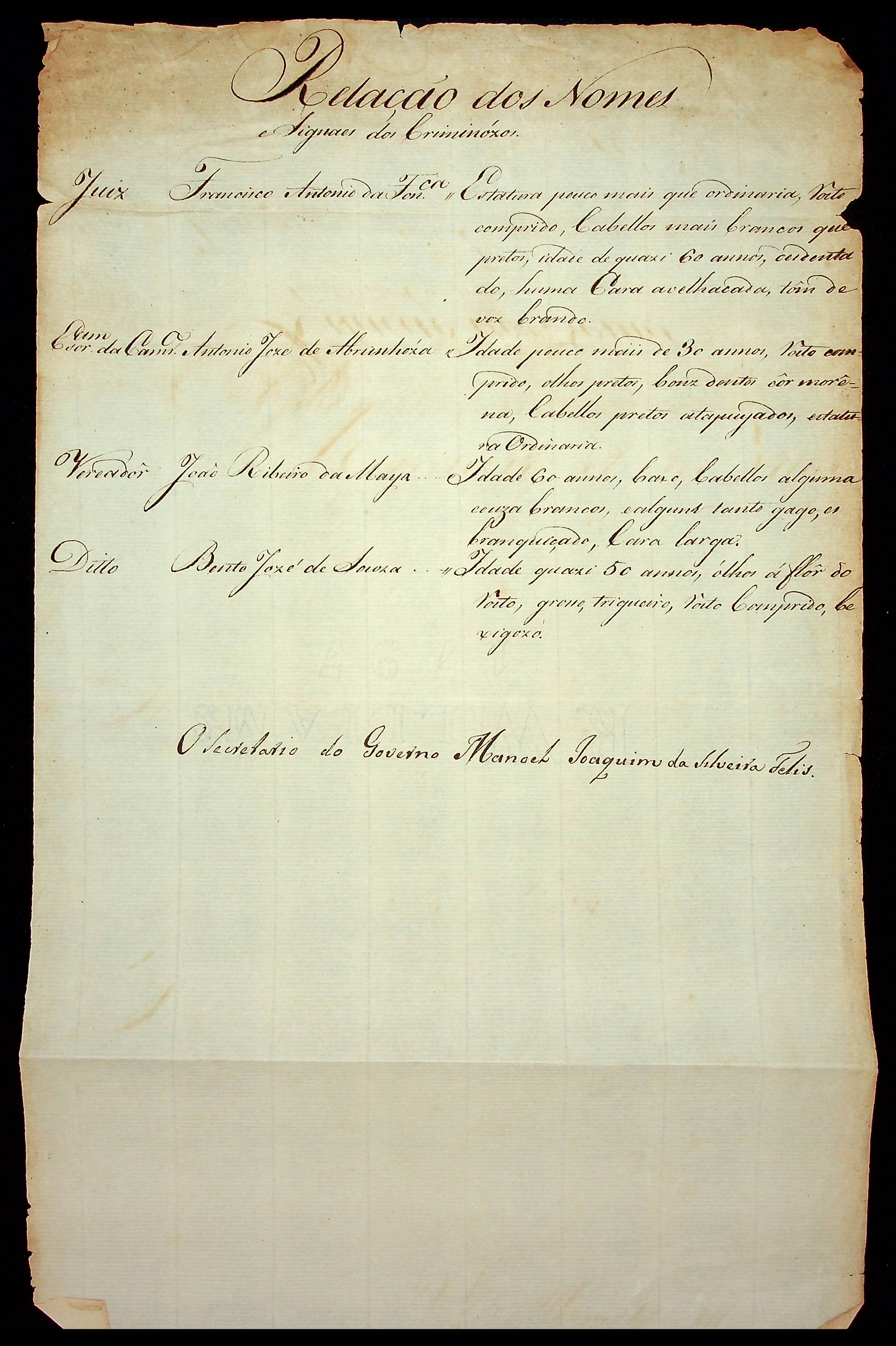 RELAÇÃO dos nomes e sinais dos criminosos, elaborada pelo Secretário de Governo da Capitania [...] Manoel Joaquim da Silveira Felix.