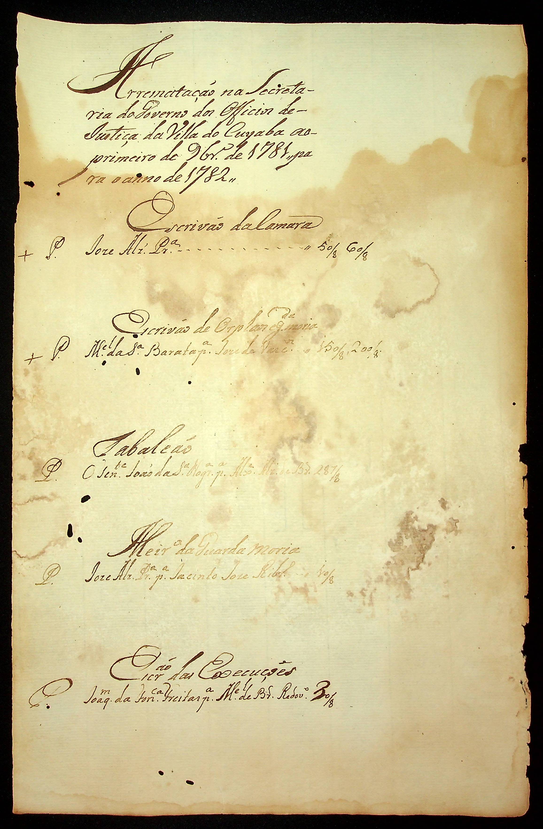 RELAÇÃO (conjunto) das arrematações na Secretária do Governo dos Ofícios da Justiça da Vila Cuiabá.