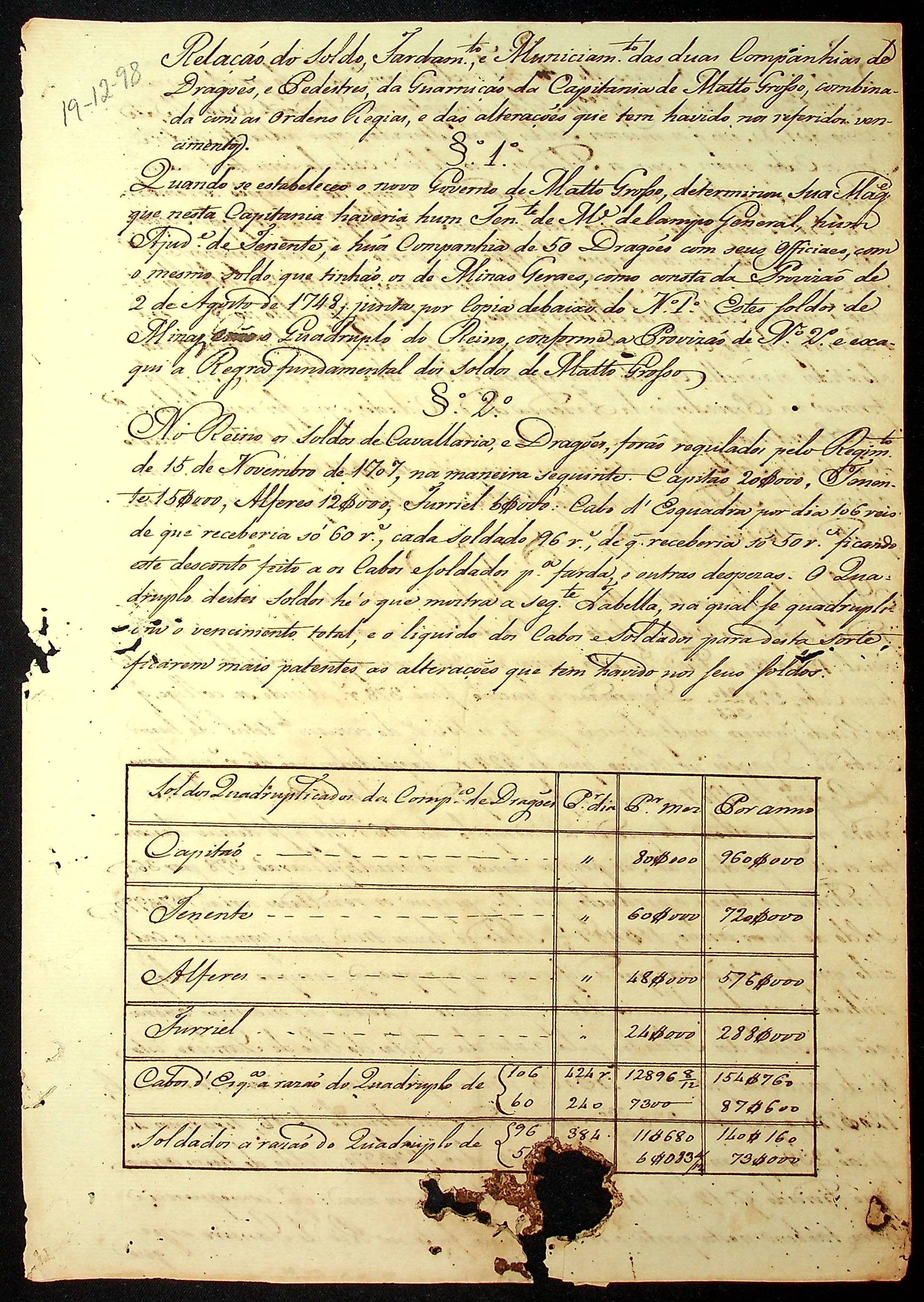 RELAÇÃO do soldo, fardamento, e municiamento das duas companhias de Dragões e Pedestres da Guarnição da Capitania de Mato Grosso, combinada com as ordens Régias e das alterações que ocorreram nos referidos vencimentos, feita pelo Secretário de governo Joaquim Cavalcanti de Albuquerque Lima.