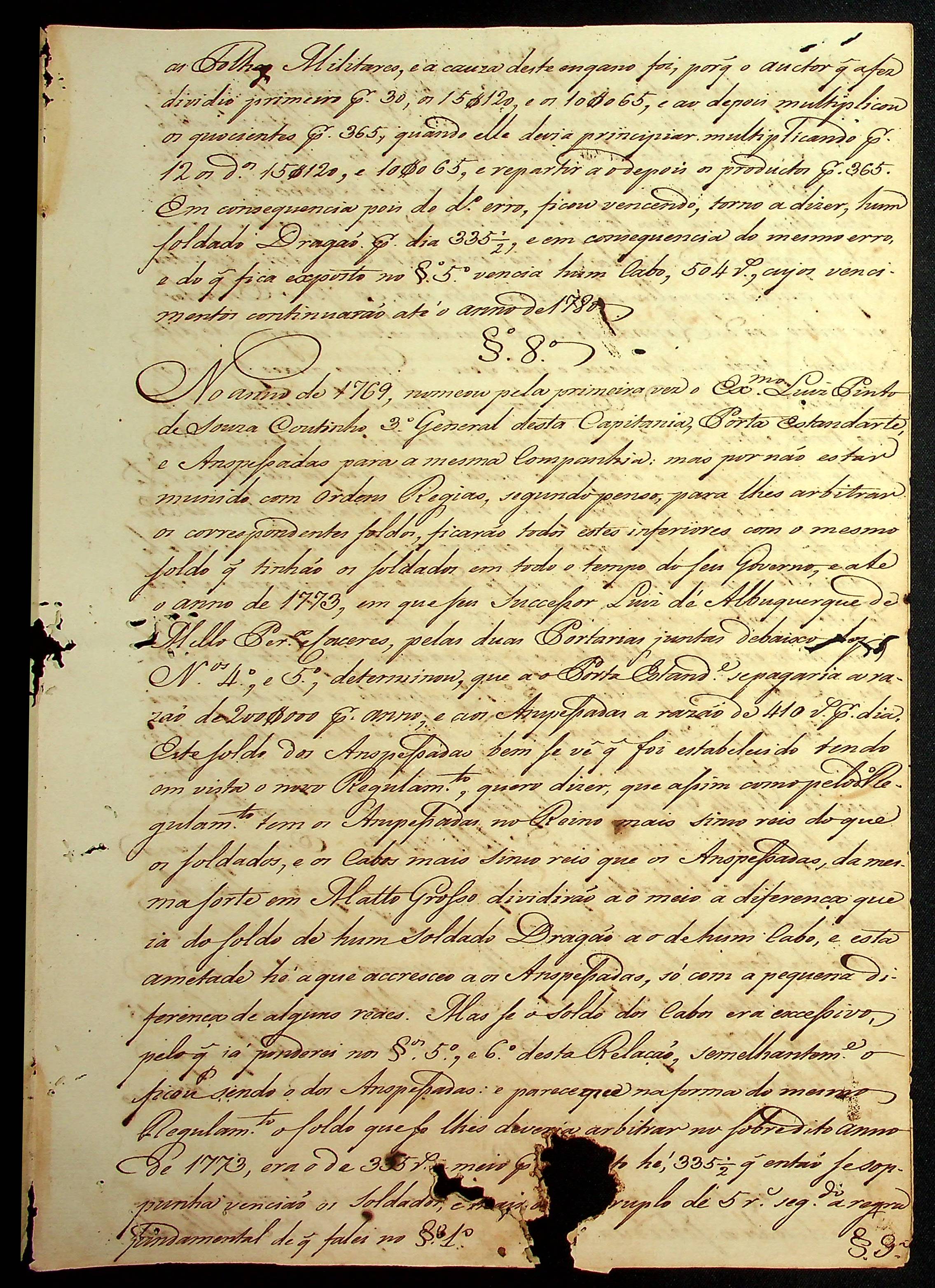 RELAÇÃO do soldo, fardamento, e municiamento das duas companhias de Dragões e Pedestres da Guarnição da Capitania de Mato Grosso, combinada com as ordens Régias e das alterações que ocorreram nos referidos vencimentos, feita pelo Secretário de governo Joaquim Cavalcanti de Albuquerque Lima.