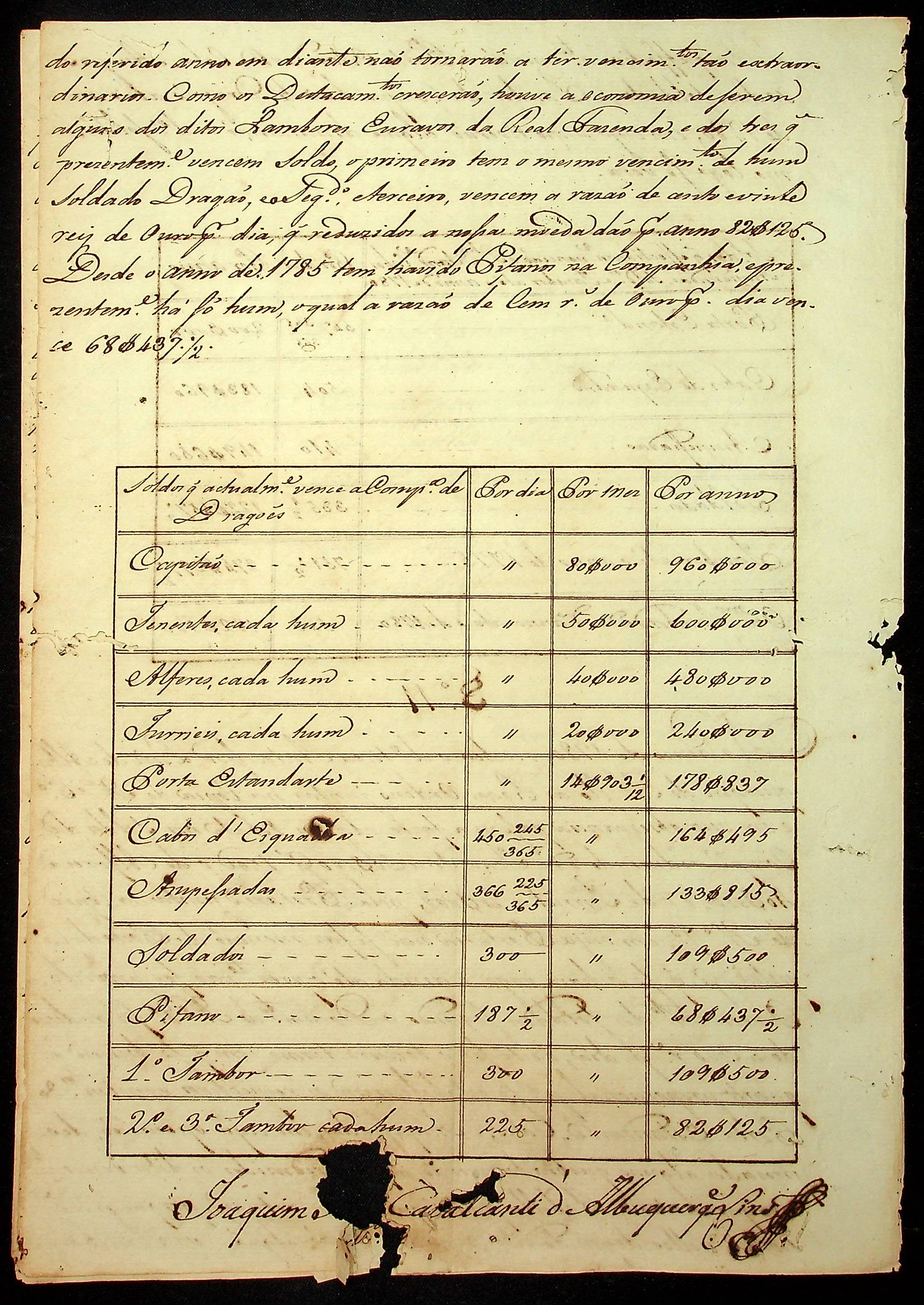 RELAÇÃO do soldo, fardamento, e municiamento das duas companhias de Dragões e Pedestres da Guarnição da Capitania de Mato Grosso, combinada com as ordens Régias e das alterações que ocorreram nos referidos vencimentos, feita pelo Secretário de governo Joaquim Cavalcanti de Albuquerque Lima.