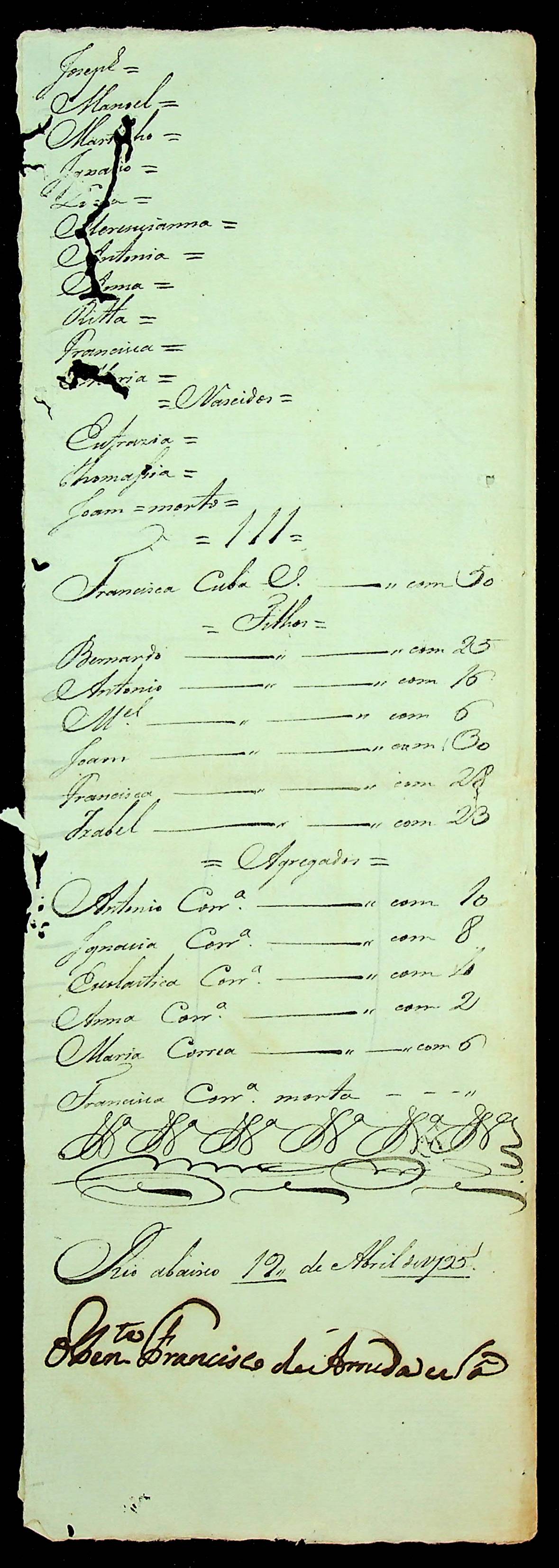 RELAÇÃO do Estado da população do Distrito do Rio Cuiabá Abaixo, de uma parte desde a derradeira povoação até o sítio e engenho do Capitão Ivan Godoi Moreira, passada pelo Tenente Francisco de Arruda e [Souza].