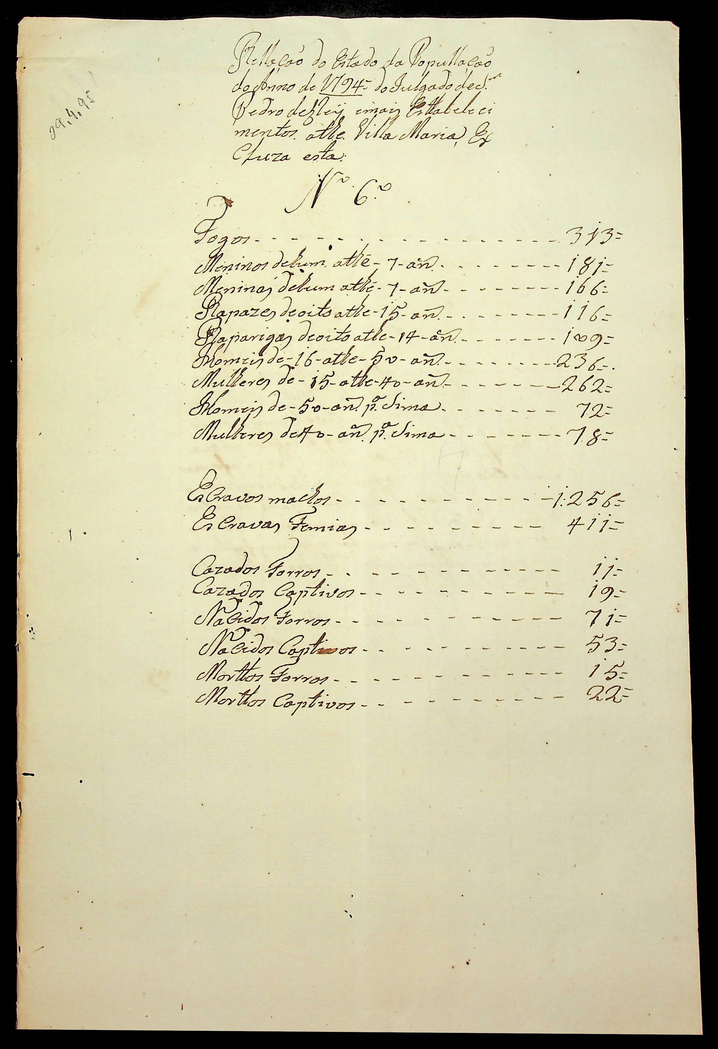 RELAÇÃO do estado da população do julgado de São Pedro del´Rei e mais estabelecimentos até Vila Maria, passada por Bernardo da Silva Santos.