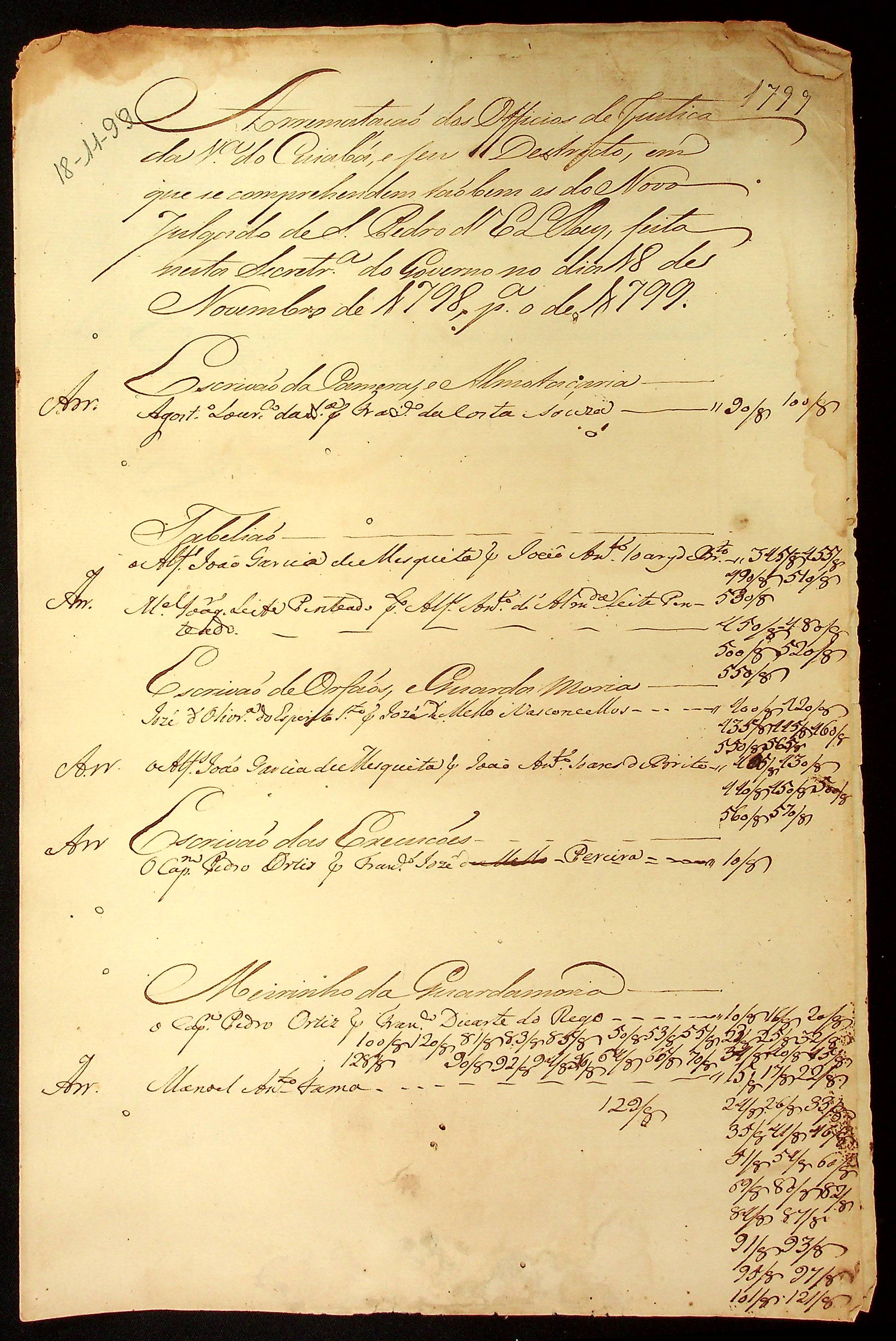 RELAÇÃO de arrematação dos ofícios de justiça da Vila do Cuiabá e seu distrito, em que se compreende, também as do novo Julgado de São Pedro D´El Rei, feita na Secretaria de Governo, no ano de 1799 para o 1800.