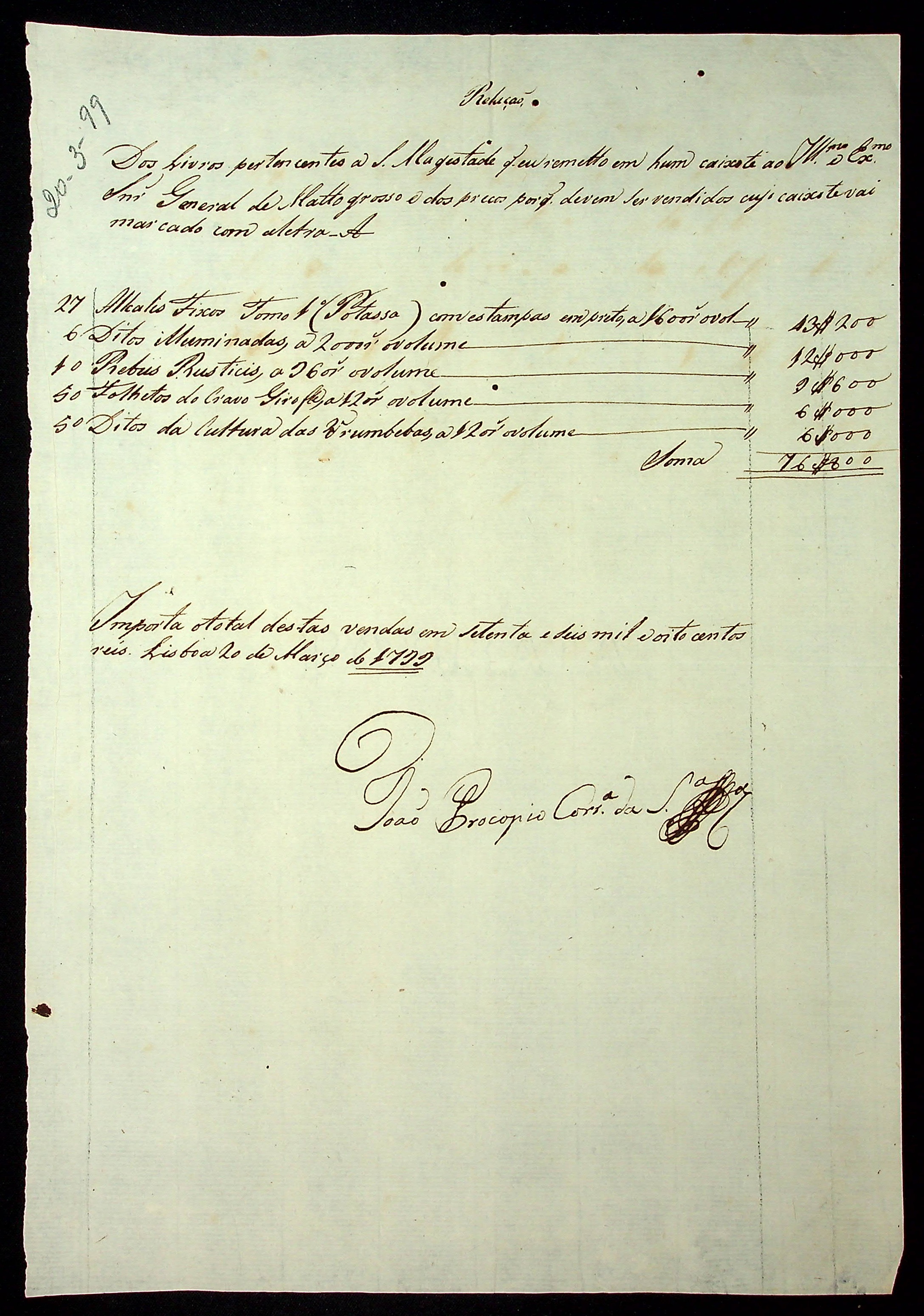 RELAÇÃO dos livros pertencentes a sua Majestade remetida pelo João Procópio Correia da [Sª], ao [Governador e Capitão-General da Capitania de Mato Grosso Caetano Pinto de Miranda e Montenegro].