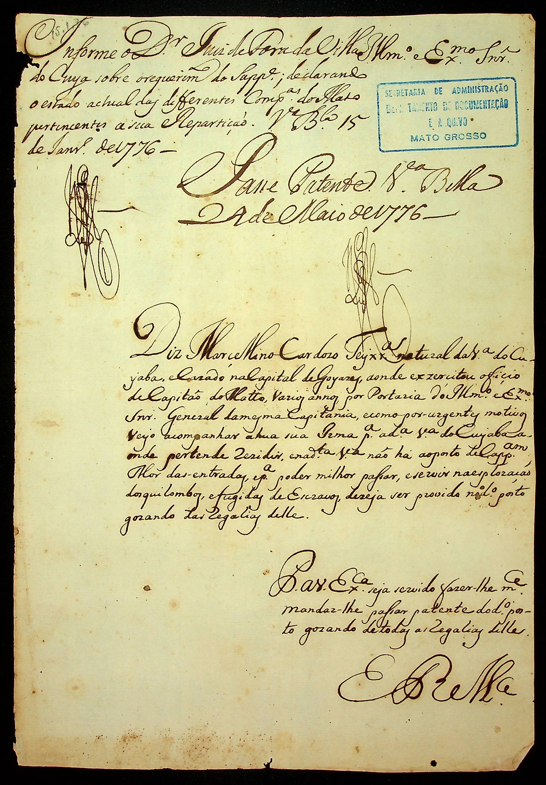REQUERIMENTO de Marcelino Cardoso Teixeira ao [Governador e Capitão-General da Capitania de Mato Grosso] Luiz de Albuquerque de Melo Pereira e Cáceres.