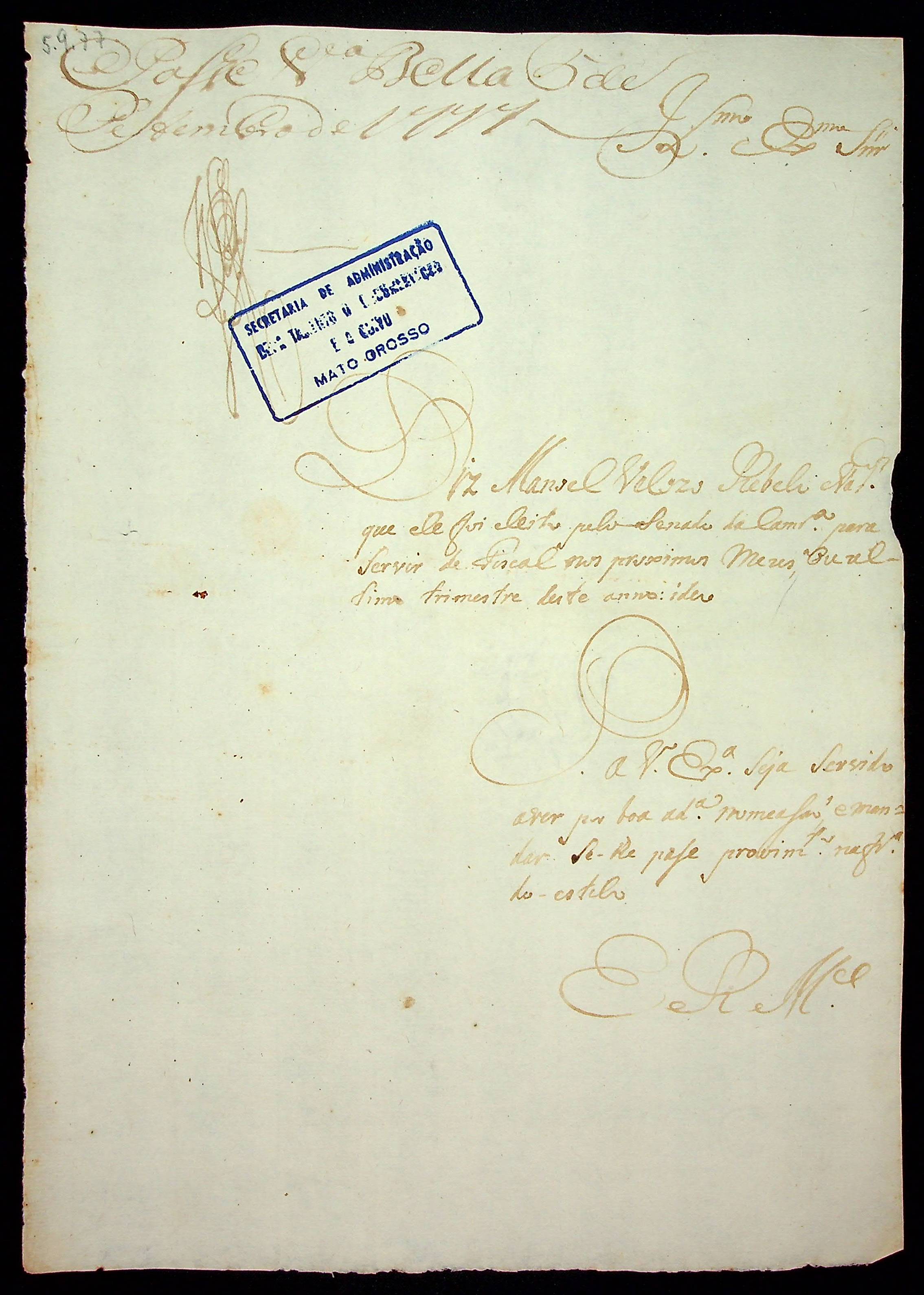 REQUERIMENTO de Manoel Veloso ao [Governador e Capitão-General da Capitania de Mato Grosso] Luiz de Albuquerque de Melo Pereira e Cáceres, solicitando nomeação ao cargo de fiscal da Câmara.