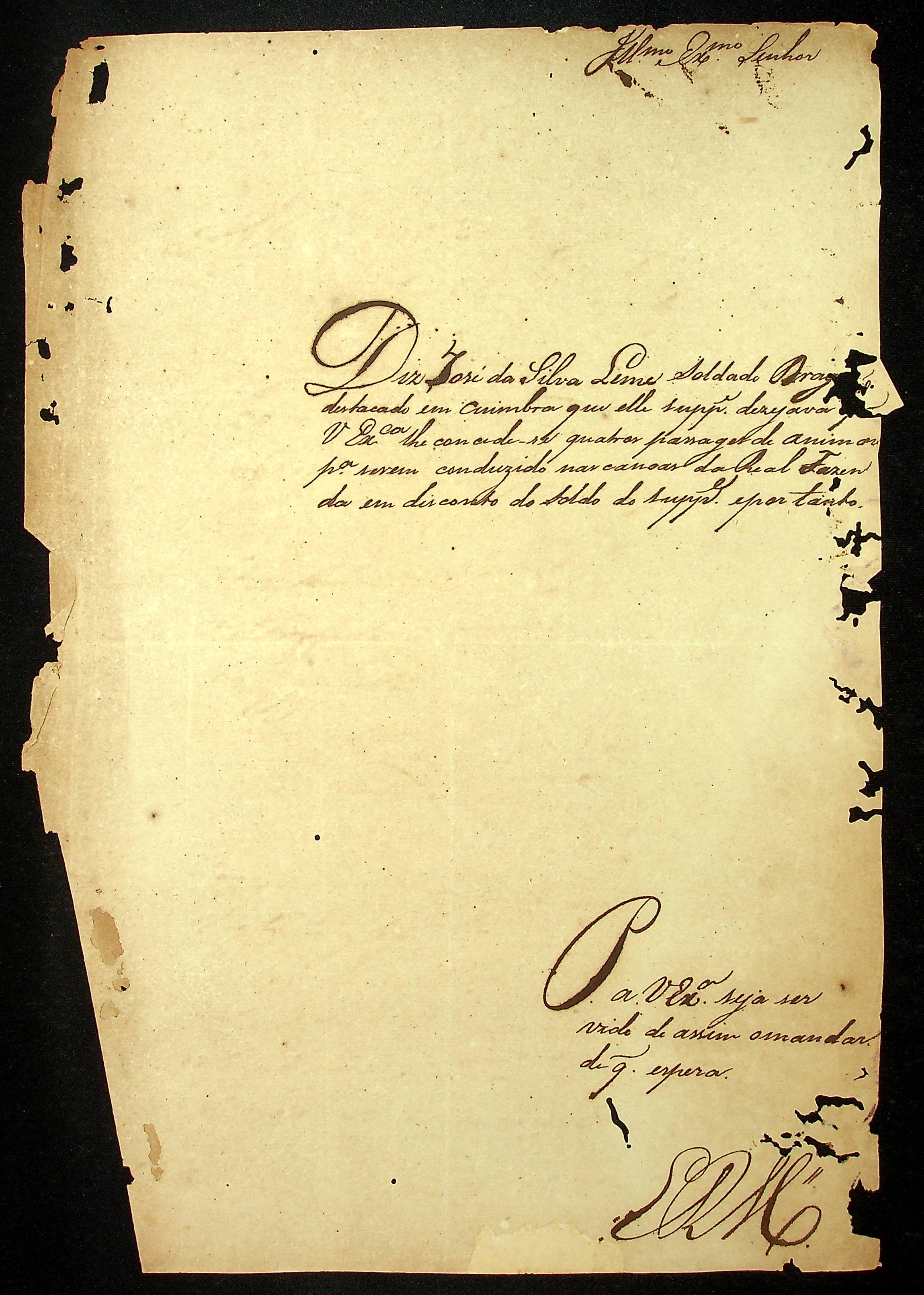REQUERIMENTO do Soldado Dragão José da Silva Leme, destacado em Coimbra, ao [Governador e Capitão-General da Capitania de Mato Grosso].