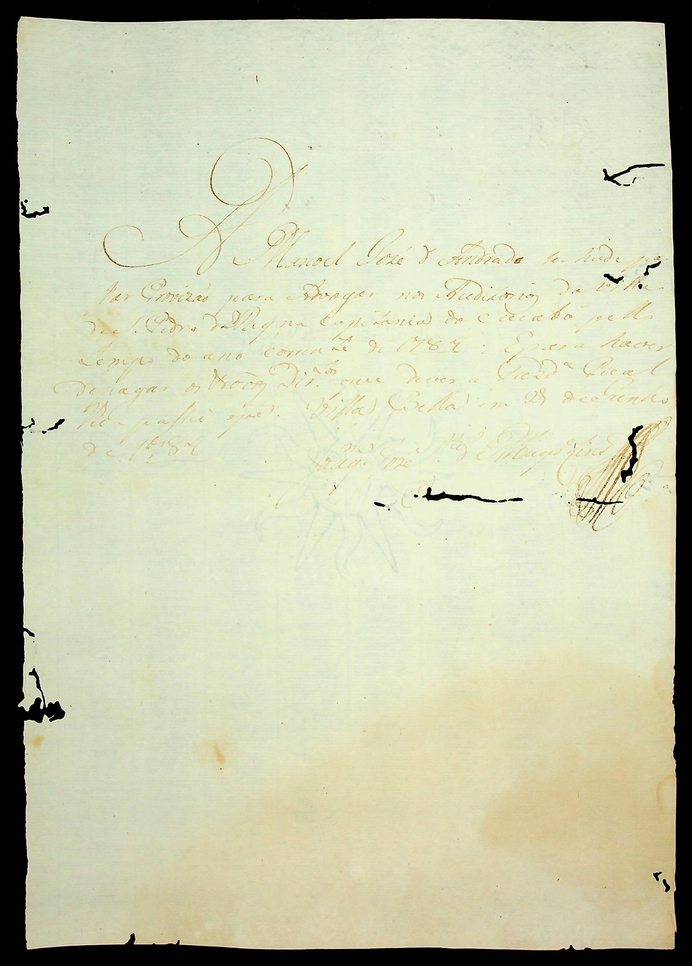 REQUERIMENTO de Manoel José de Andrade ao [Governador e Capitão-General da Capitania de Mato Grosso Luiz de Albuquerque de Melo Pereira e Cáceres], solicitando provisão para exercer o Cargo de Advogado no Arraial de São Pedro D' El Rey.