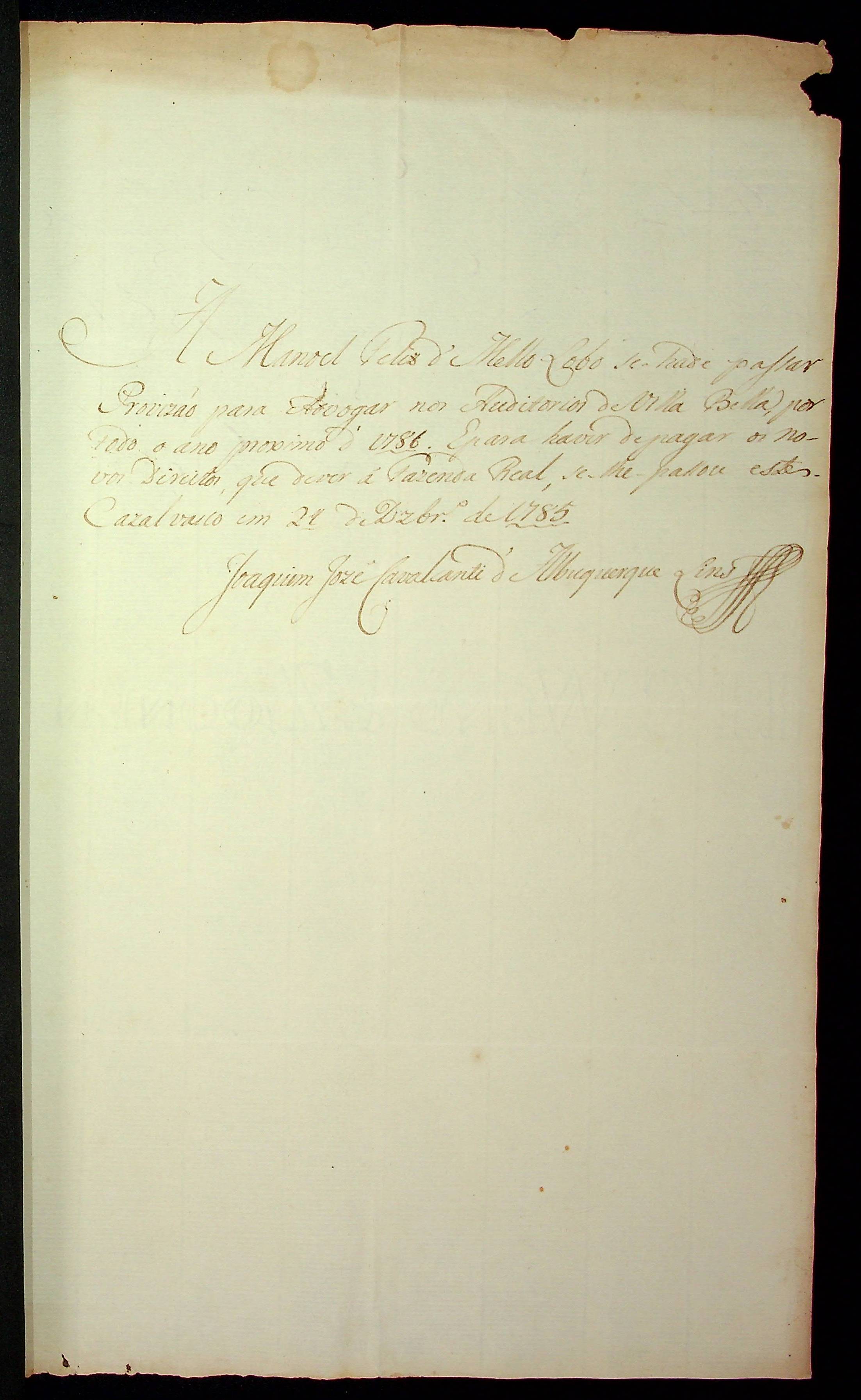 REQUERIMENTO de Manoel Felix de Mello Lobo ao [Governador e Capitão-General da Capitania de Mato Grosso Luiz de Albuquerque de Melo Pereira e Cáceres], pela renovação de sua provisão para advogar.