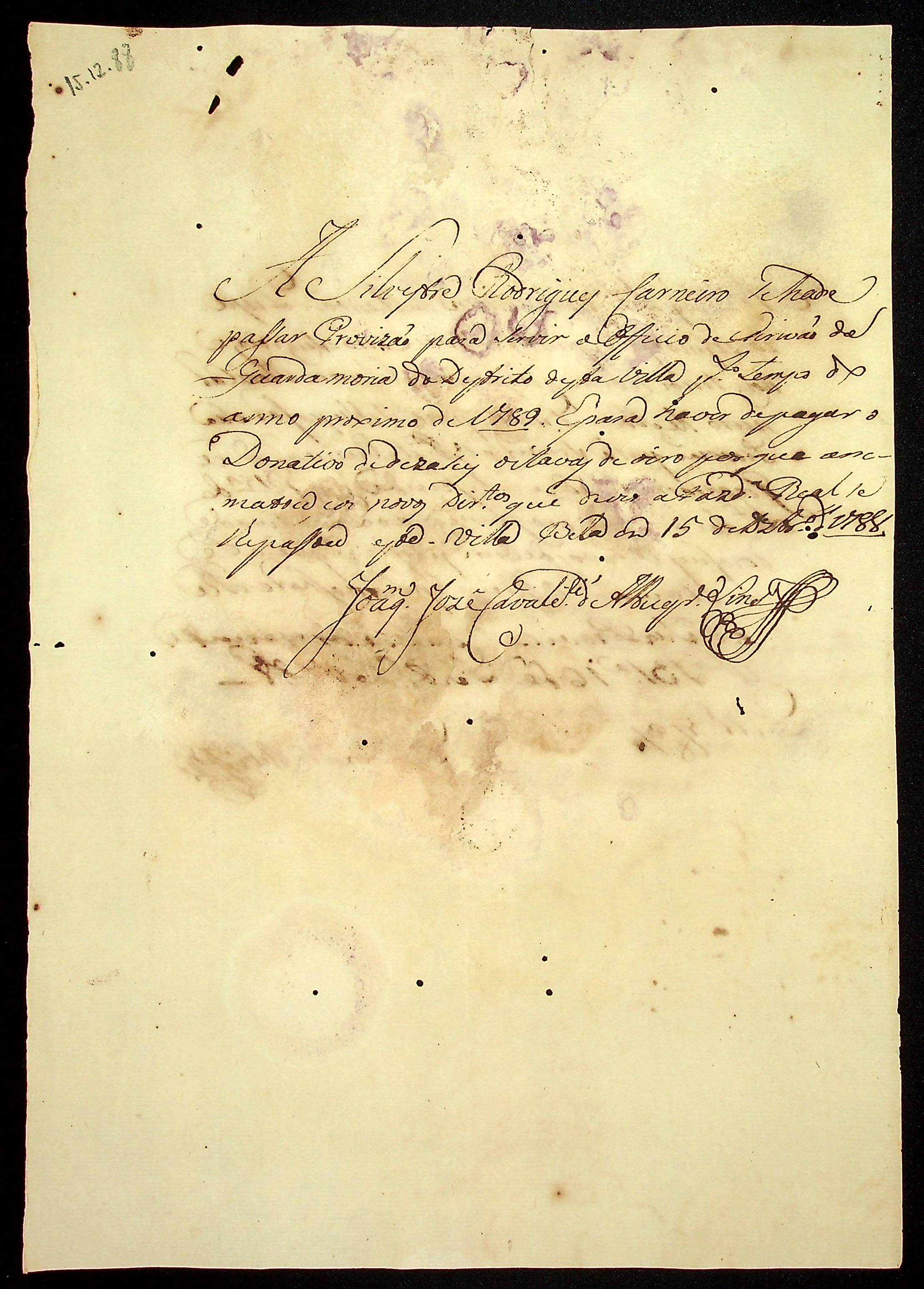 REQUERIMENTO de Silvestre Rodrigues Carneiro ao [Governador e Capitão-General da Capitania de Mato Grosso Luiz de Albuquerque de Melo Pereira e Cáceres], pelo ofício de escrivão da Guardamoria de São Vicente.