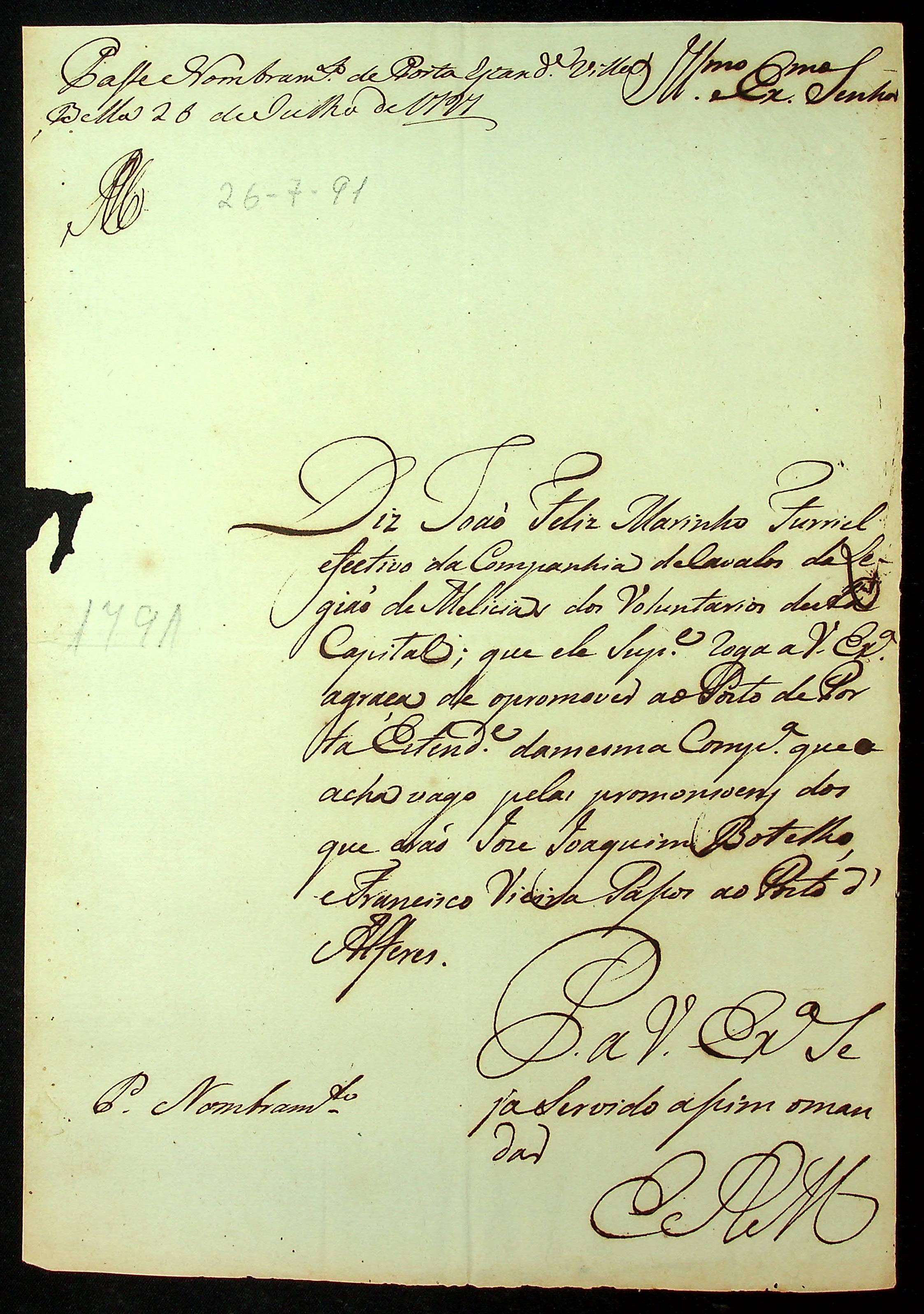 REQUERIMENTO de João Feliz Marinho ao [Governador e Capitão General da Capitania de Mato Grosso] João de Albuquerque de Mello Pereira e Cáceres ao posto de Porta Estandarte da Companhia de Cavalos da Legião de Milícias dos Voluntários.
