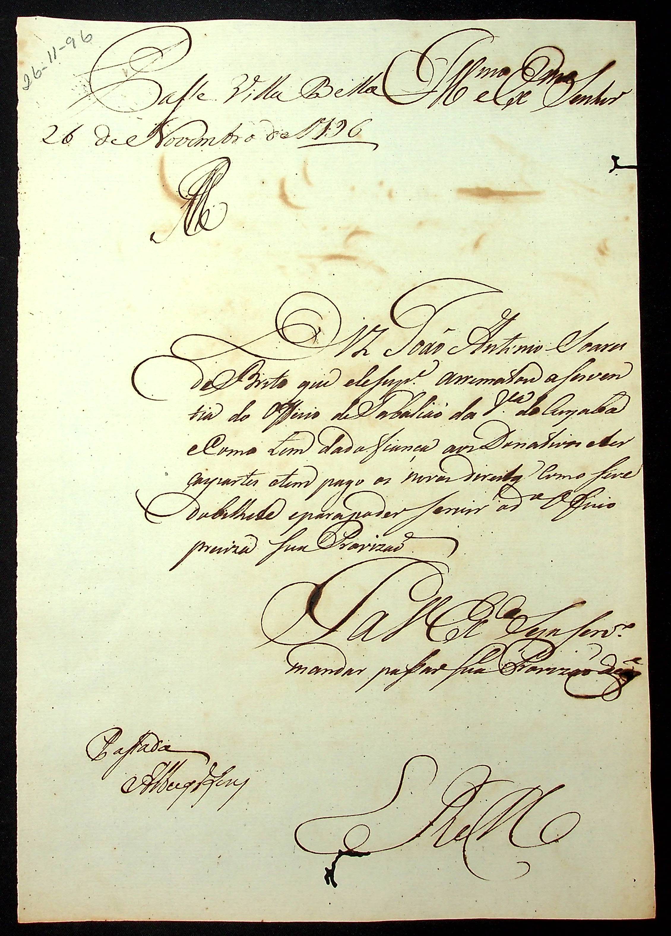 REQUERIMENTO de João Antônio Soares de Brito ao [Governador e Capitão General da Capitania de Mato Grosso Caetano Pinto de Miranda Montenegro], solicita sua provisão do cargo de Tabelião da Vila do Cuiabá.