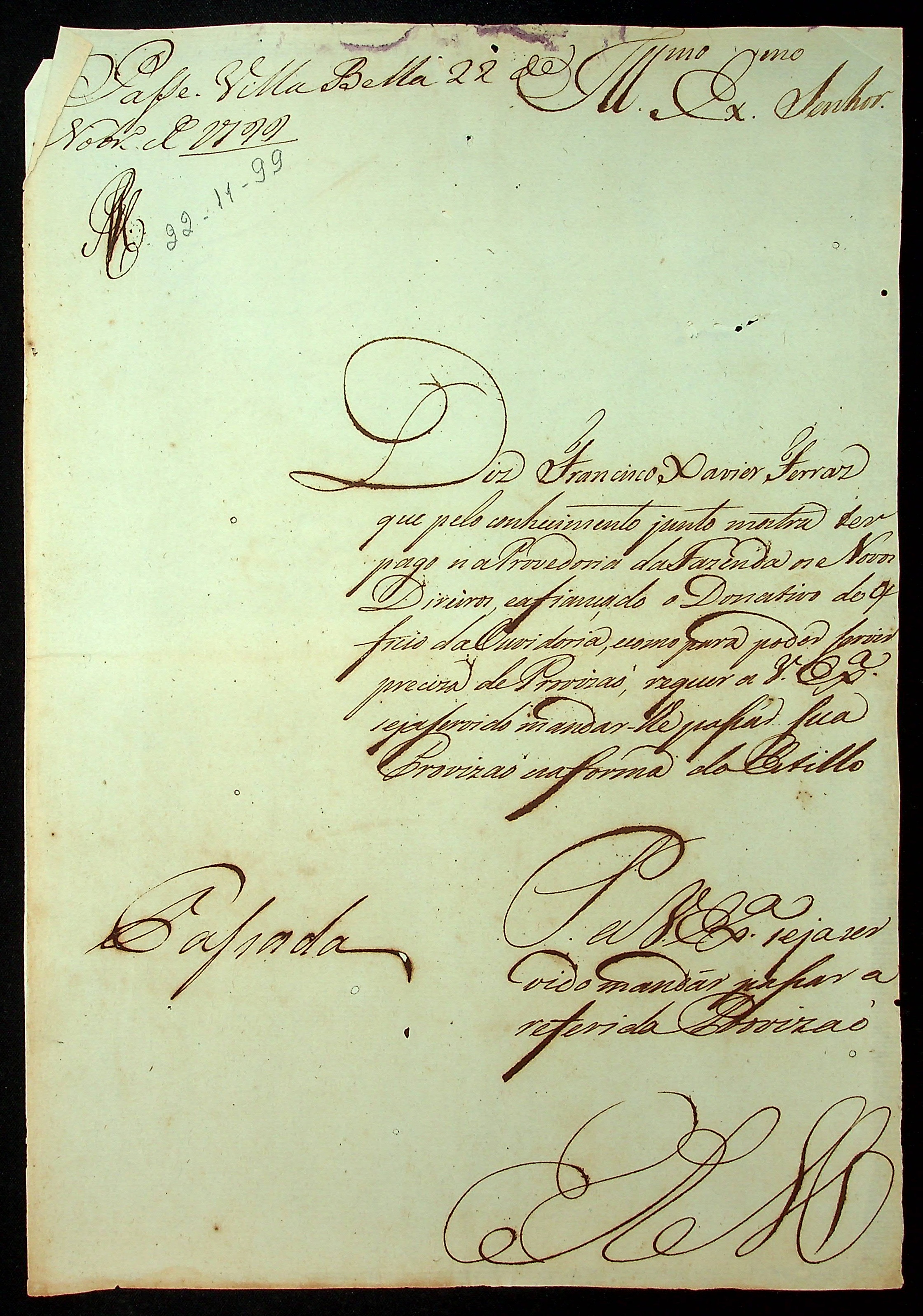 REQUERIMENTO de Francisco Xavier Ferraz ao [Governador e Capitão-General da Capitania de Mato Grosso Caetano Pinto de Miranda e Montenegro] pelo ofício de Escrivão da Ouvidoria.
