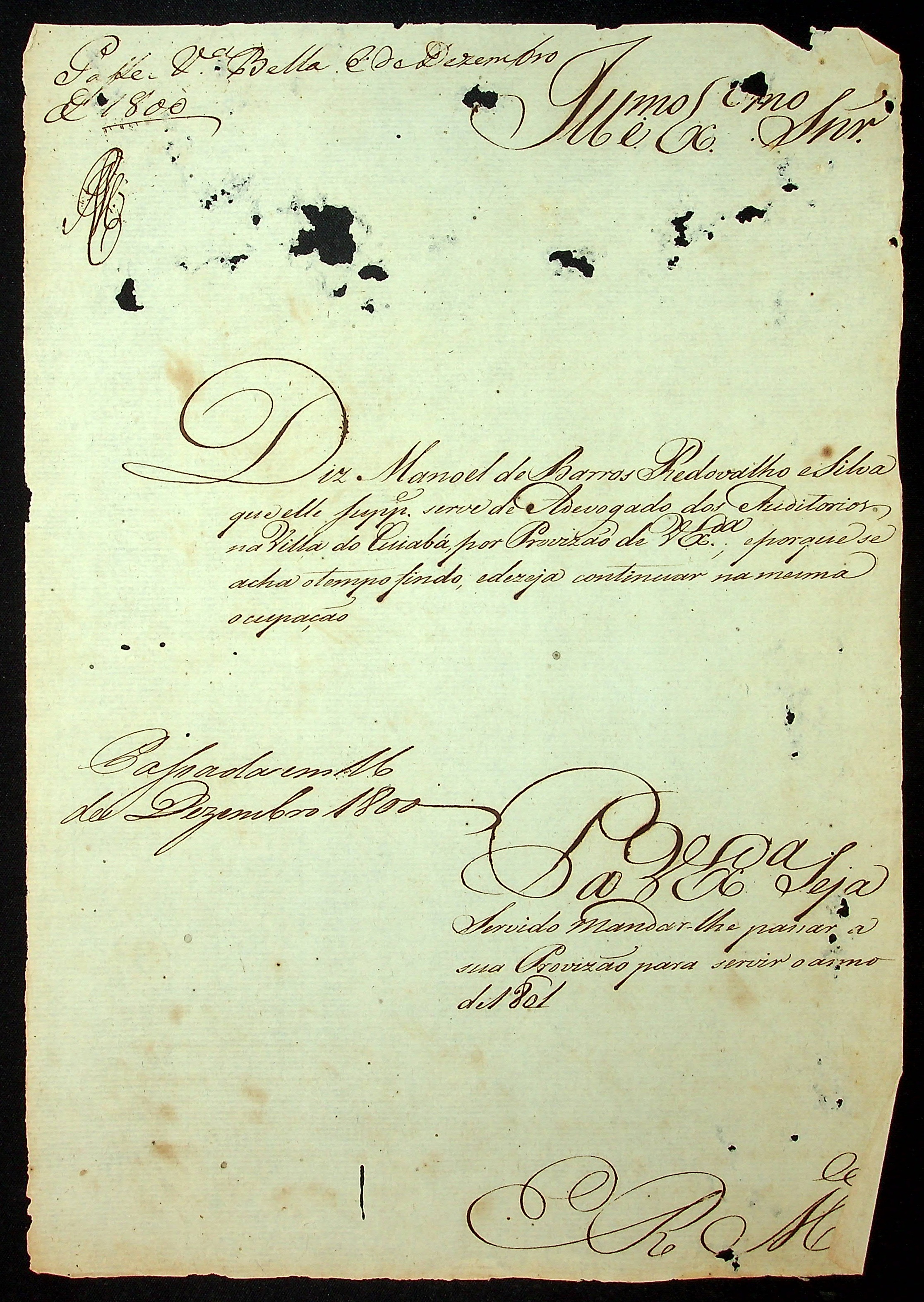 REQUERIMENTO de Manoel de Barros Rodovalho e Silva ao [Governador e Capitão General da Capitania de Mato Grosso Caetano Pinto de Miranda Montenegro] para advogar nos Auditórios da Vila do Cuiabá.