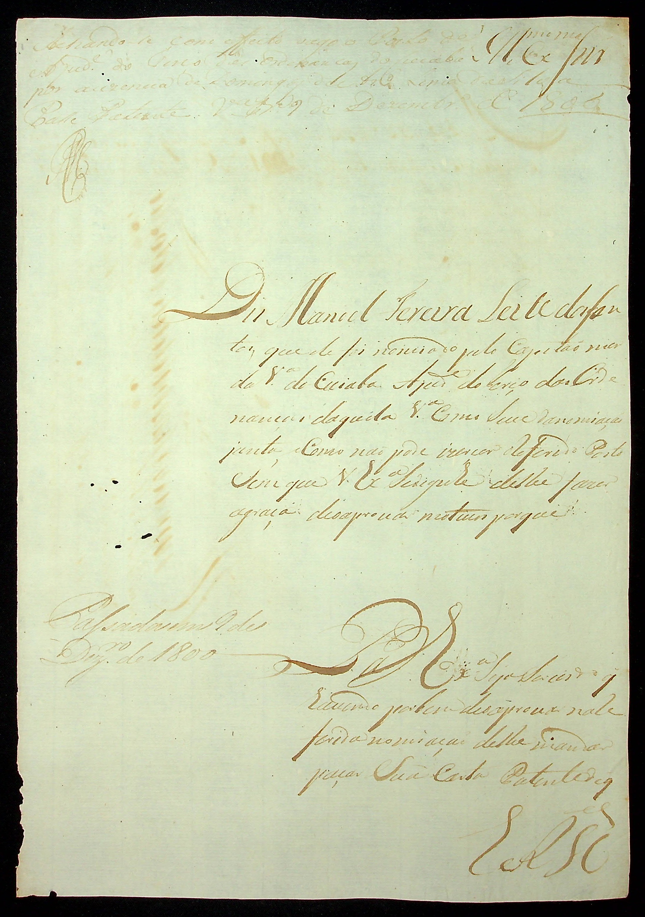 REQUERIMENTO de Manoel Ferreira Leite dos Santos ao [Governador e Capitão General da Capitania de Mato Grosso Caetano Pinto de Miranda Montenegro] pelo posto de Ajudante do Terço de Ordenança da Vila do Cuiabá.