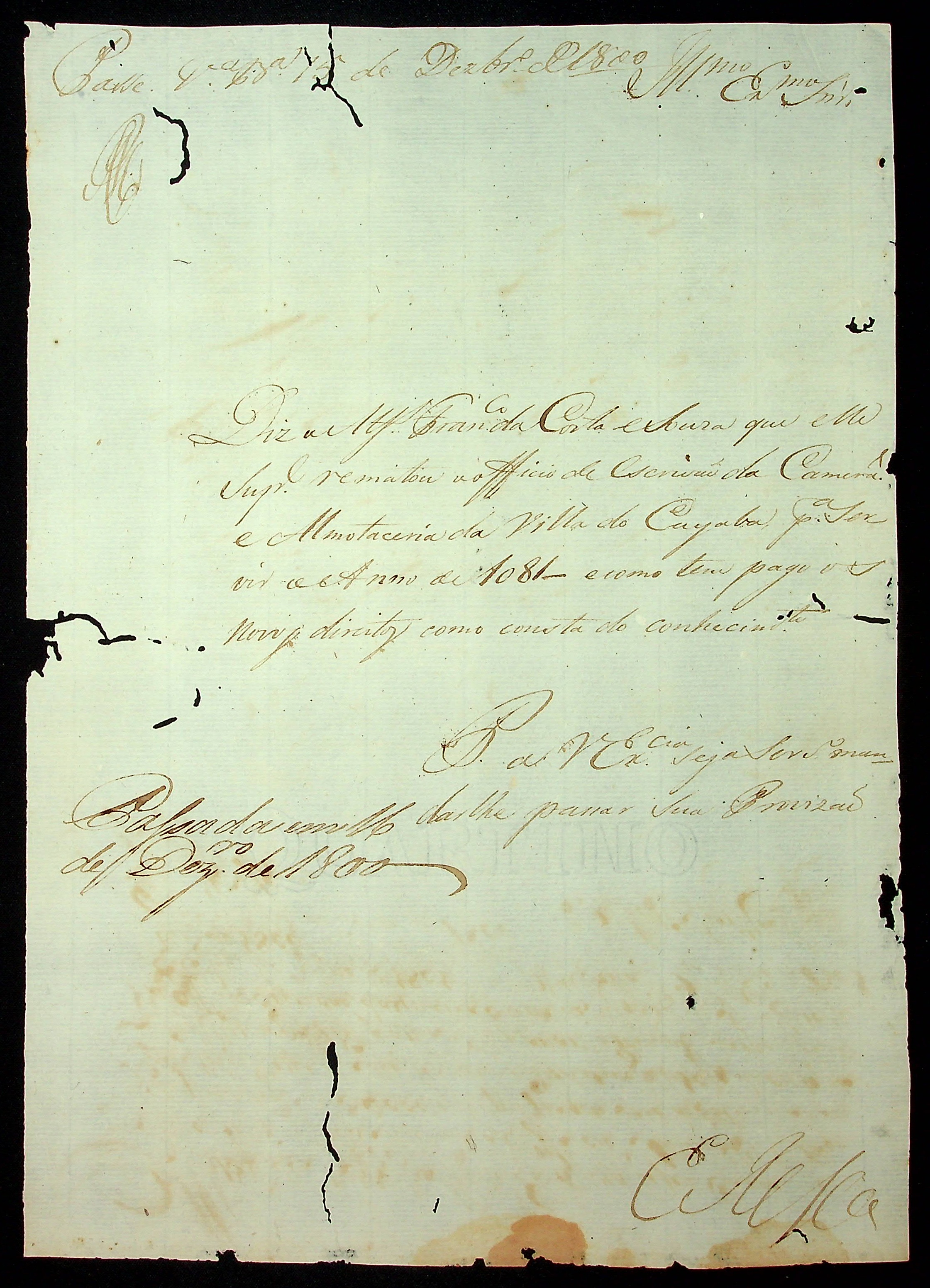 REQUERIMENTO do Alferes Francisco da Costa e Souza ao [Governador e Capitão-General da Capitania de Mato Grosso Caetano Pinto de Miranda e Montenegro] pelo ofício de Escrivão da Câmara e Almotaçaria da Vila do Cuiabá.