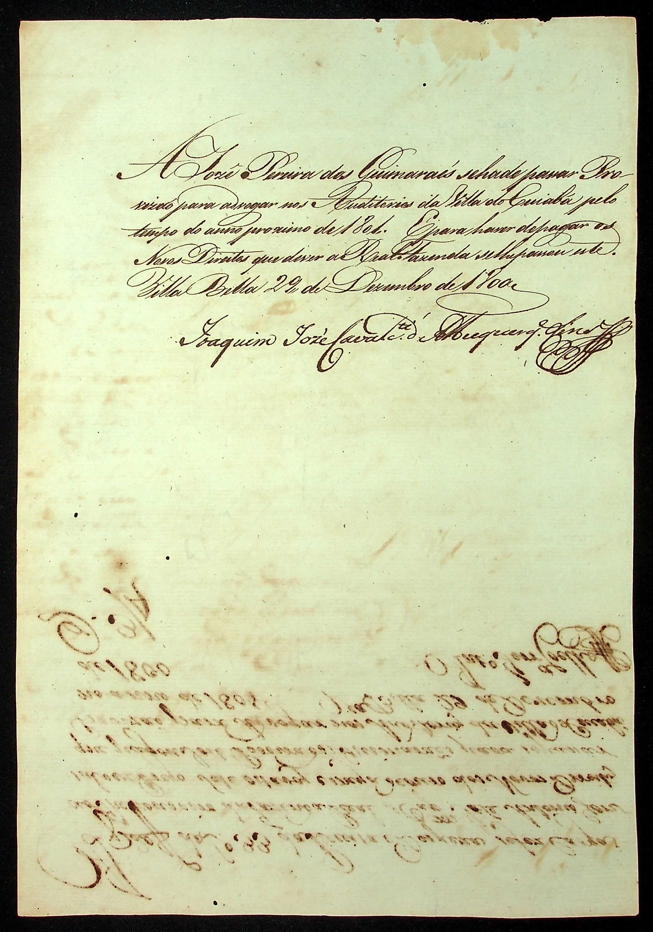 REQUERIMENTO de José Pereira dos Guimarães ao [Governador e Capitão General da Capitania de Mato Grosso Caetano Pinto de Miranda Montenegro] para advogar nos Auditórios da Vila do Cuiabá.