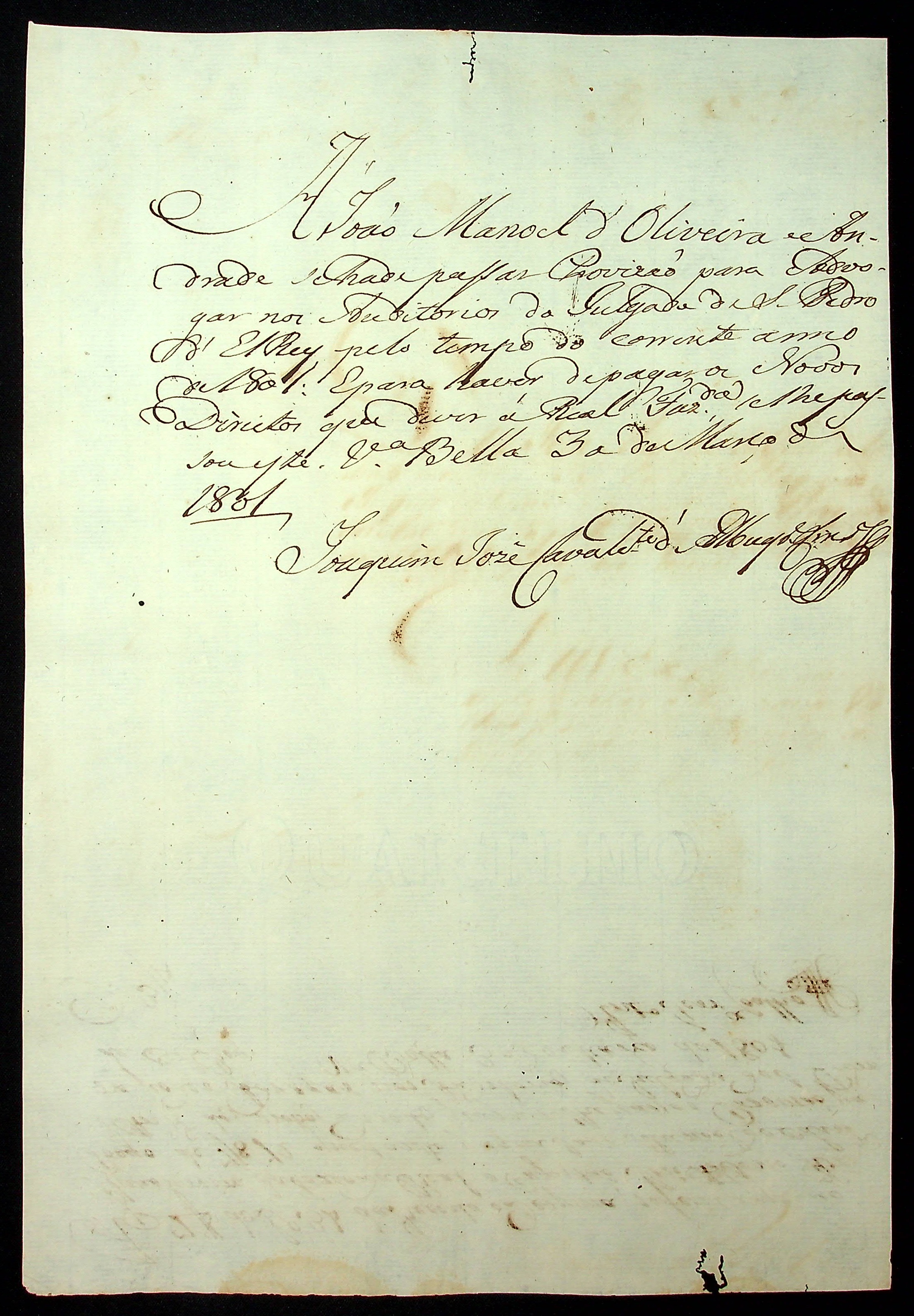REQUERIMENTO de João Manoel de Oliveira e Andrade ao [Governador e Capitão General da Capitania de Mato Grosso Caetano Pinto de Miranda Montenegro] para advogar nos Auditórios de São Pedro Del Rei.
