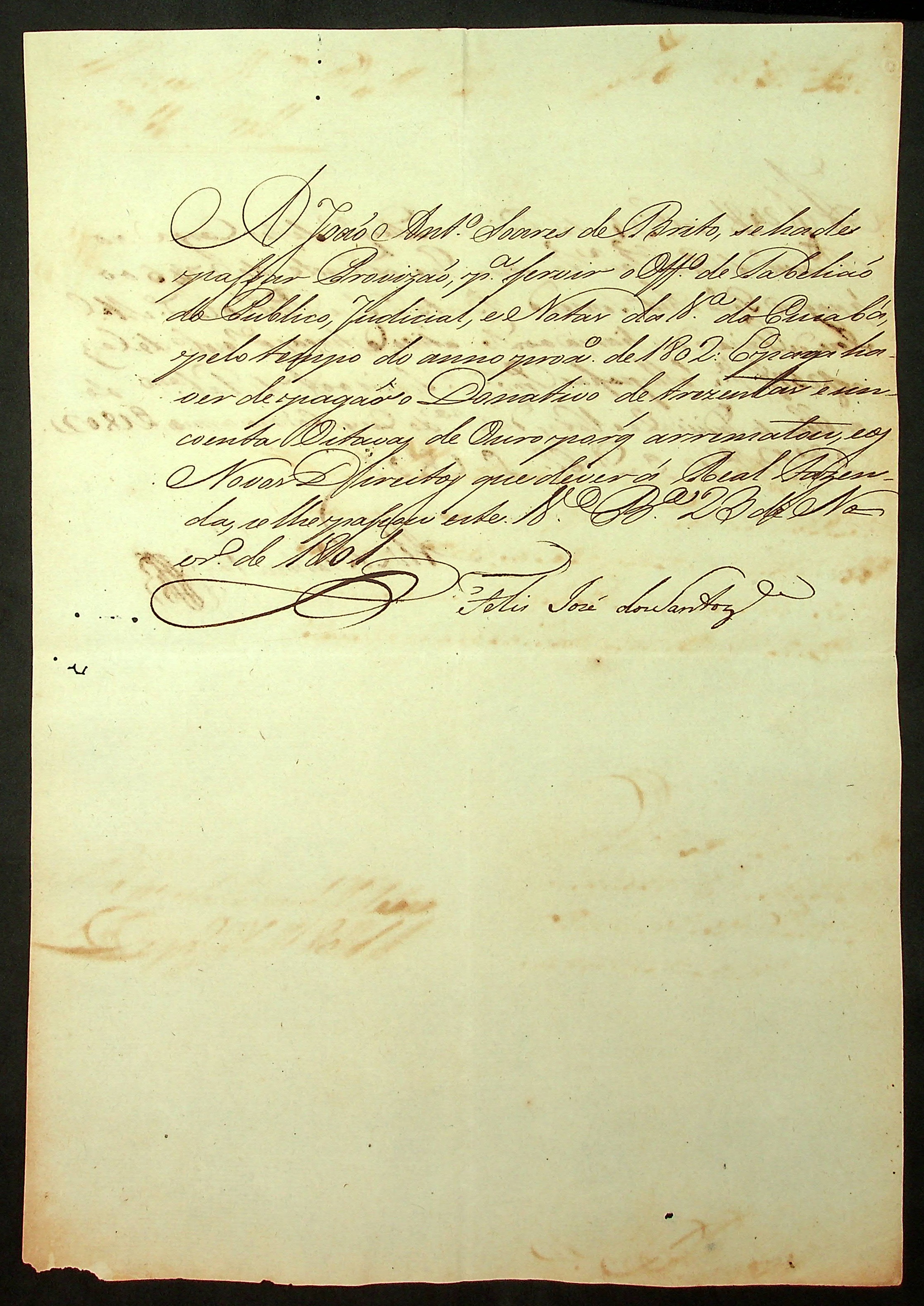 REQUERIMENTO de João Antônio Soares de Brito ao [Governador e Capitão General da Capitania de Mato Grosso Caetano Pinto de Miranda Montenegro] pelo ofício de tabelião da Vila do Cuiabá.