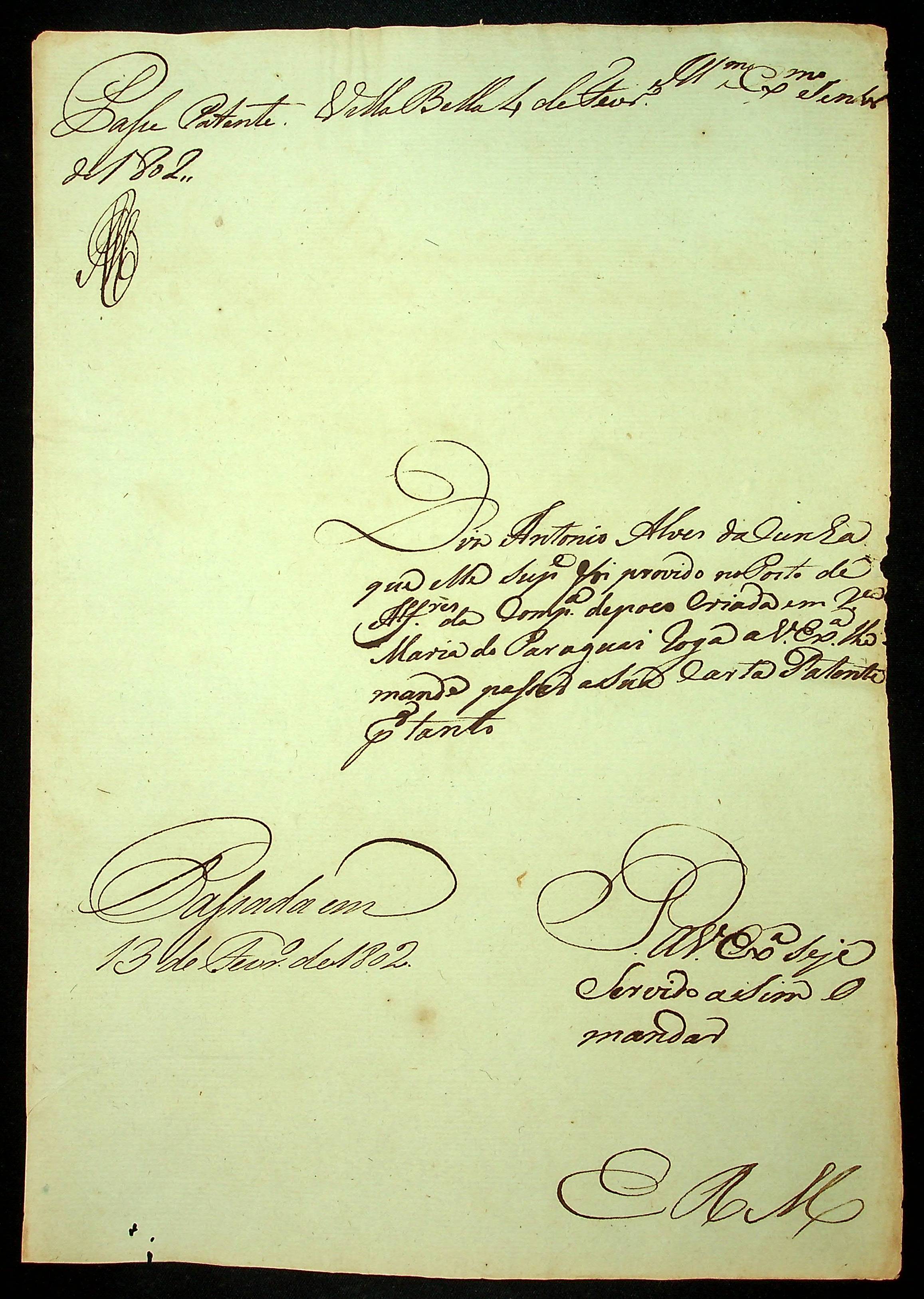 REQUERIMENTO de Antônio Alves da Cunha ao [Governador e Capitão General da Capitania de Mato Grosso Caetano Pinto de Miranda Montenegro] pelo posto de Alferes da Segunda Companhia de Vila Maria.