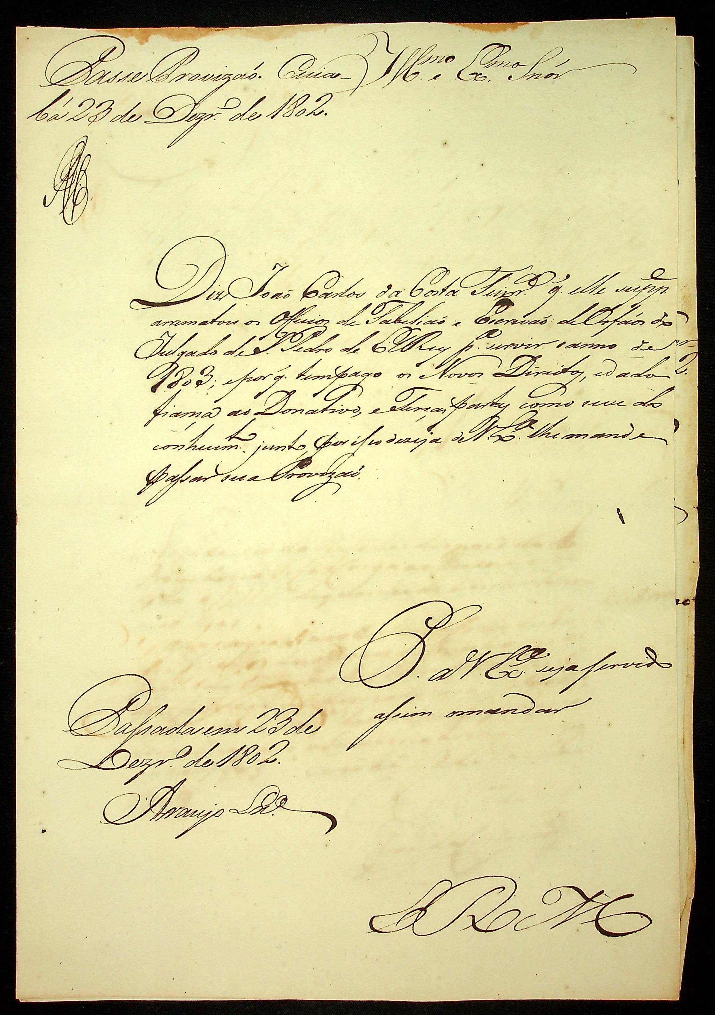 REQUERIMENTO de João Carlos da Costa Teixeira ao [Governador e Capitão General da Capitania de Mato Grosso Caetano Pinto de Miranda Montenegro] pelo ofício de Tabelião e Escrivão dos Órfãos do Julgado de São Pedro Del Rei.