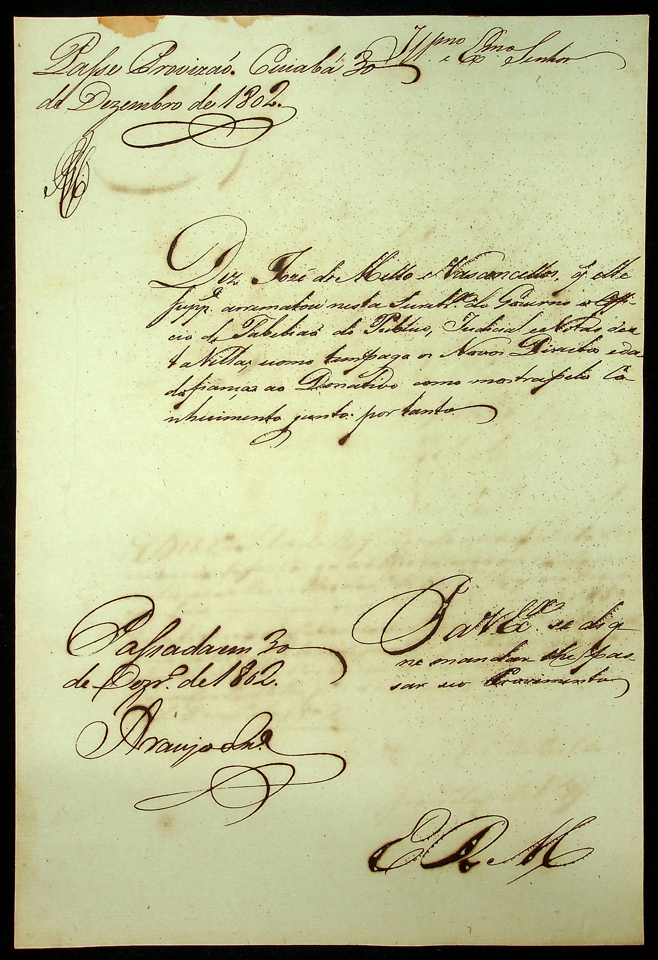 REQUERIMENTO de José de Mello e Vasconcellos ao [Governador e Capitão General da Capitania de Mato Grosso Caetano Pinto de Miranda Montenegro] pelo ofício de Tabelião do público, judicial e notas da [Vila do Cuiabá].