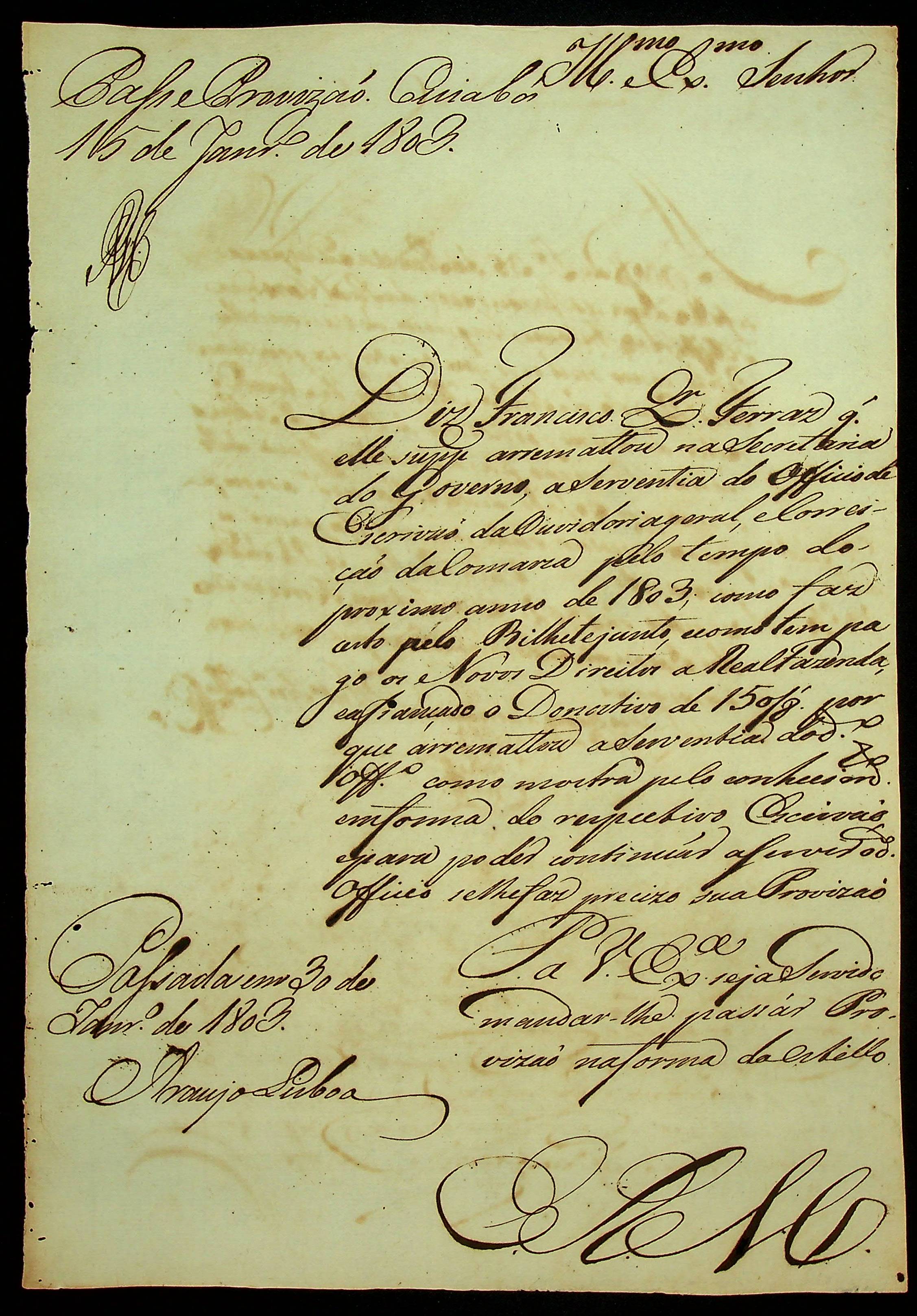 REQUERIMENTO de Francisco [Xavier] Ferraz ao [Governador e Capitão General da Capitania de Mato Grosso Caetano Pinto de Miranda Montenegro] pelo ofício de Escrivão da Ouvidoria Geral e Correição da Comarca.
