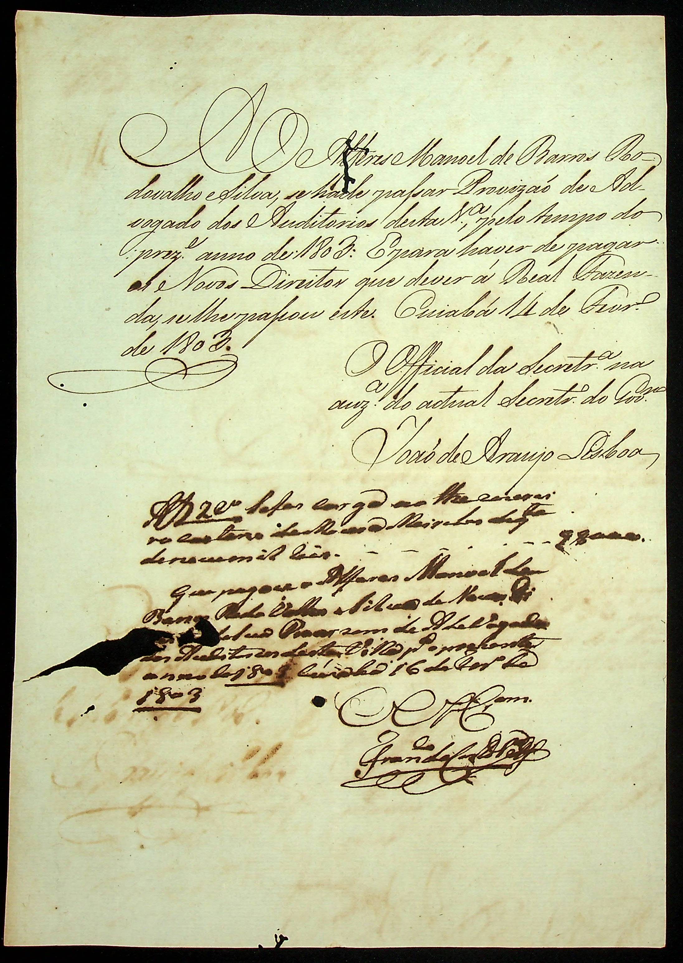 REQUERIMENTO do Alferes Manoel de Barros Rodovalho e Silva ao [Governador e Capitão General da Capitania de Mato Grosso Caetano Pinto de Miranda Montenegro] para advogar nos Auditórios da Vila do Cuiabá.