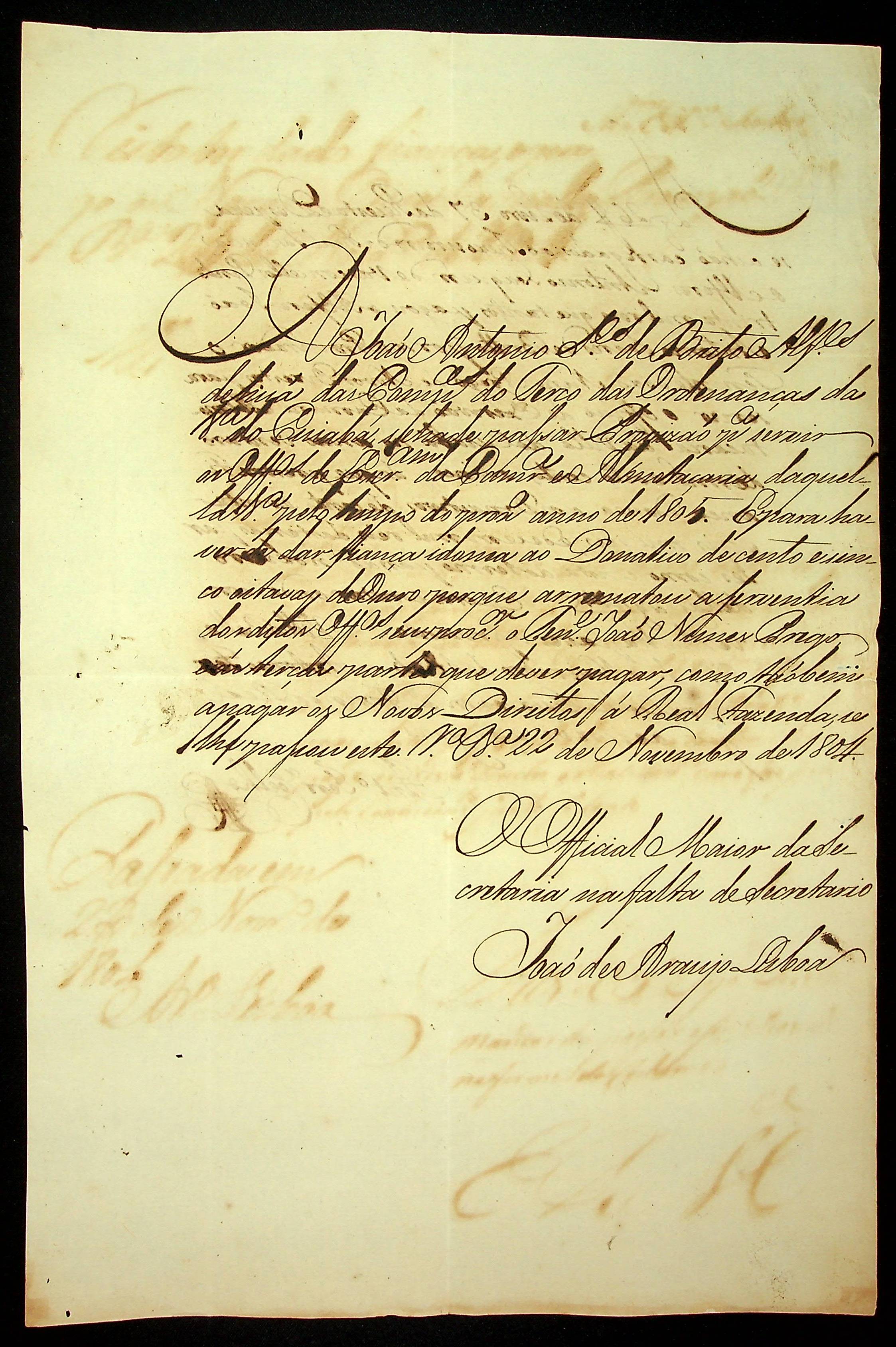 REQUERIMENTO do Alferes João Antônio Soares de Brito ao [Governador e Capitão-General da Capitania de Mato Grosso Manoel Carlos de Abreu e Menezes].