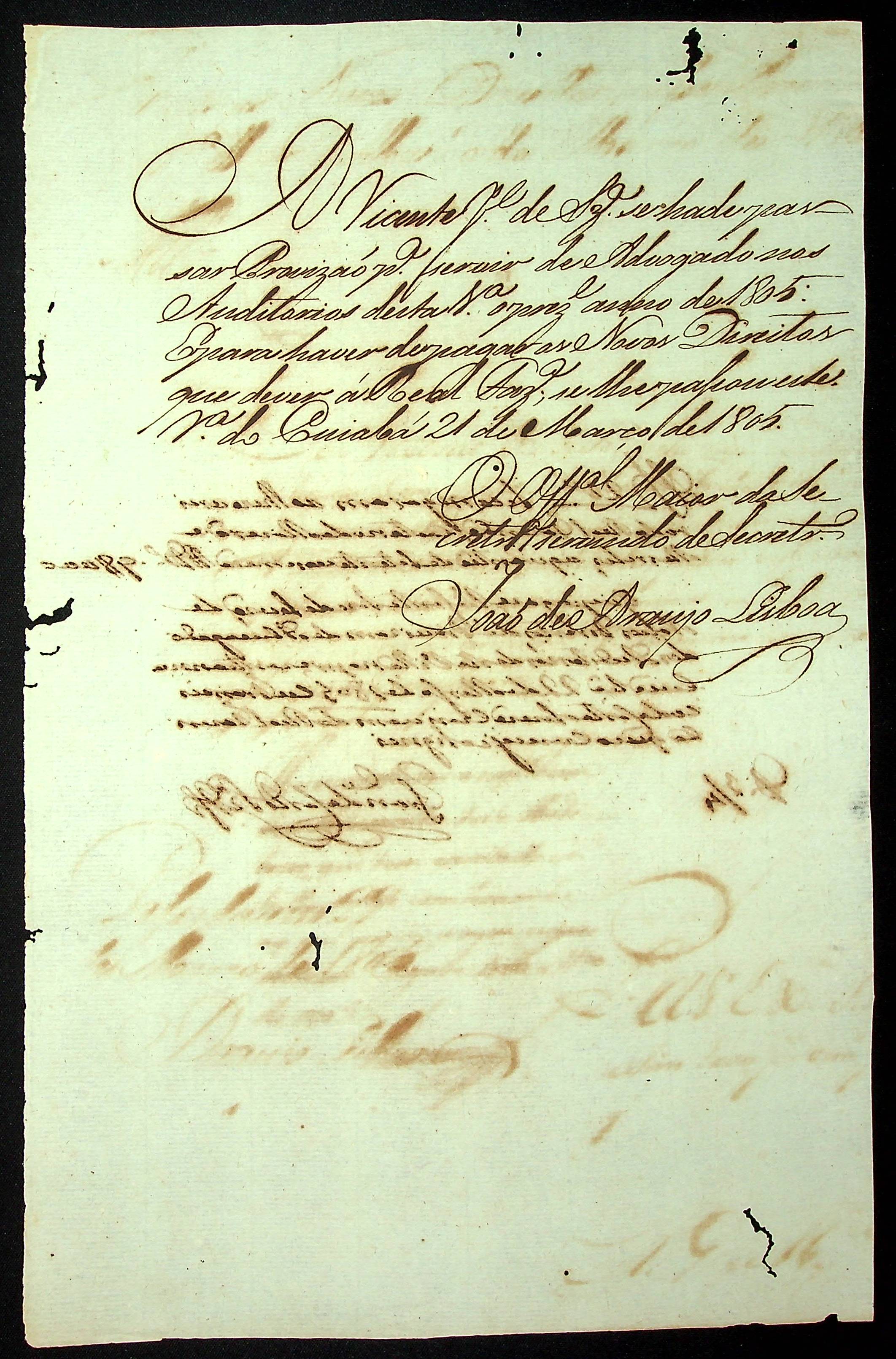REQUERIMENTO de Vicente José de Souza ao [Governador e Capitão-General da Capitania de Mato Grosso Manoel Carlos de Abreu e Menezes] para advogar nos Auditórios da Vila do Cuiabá.