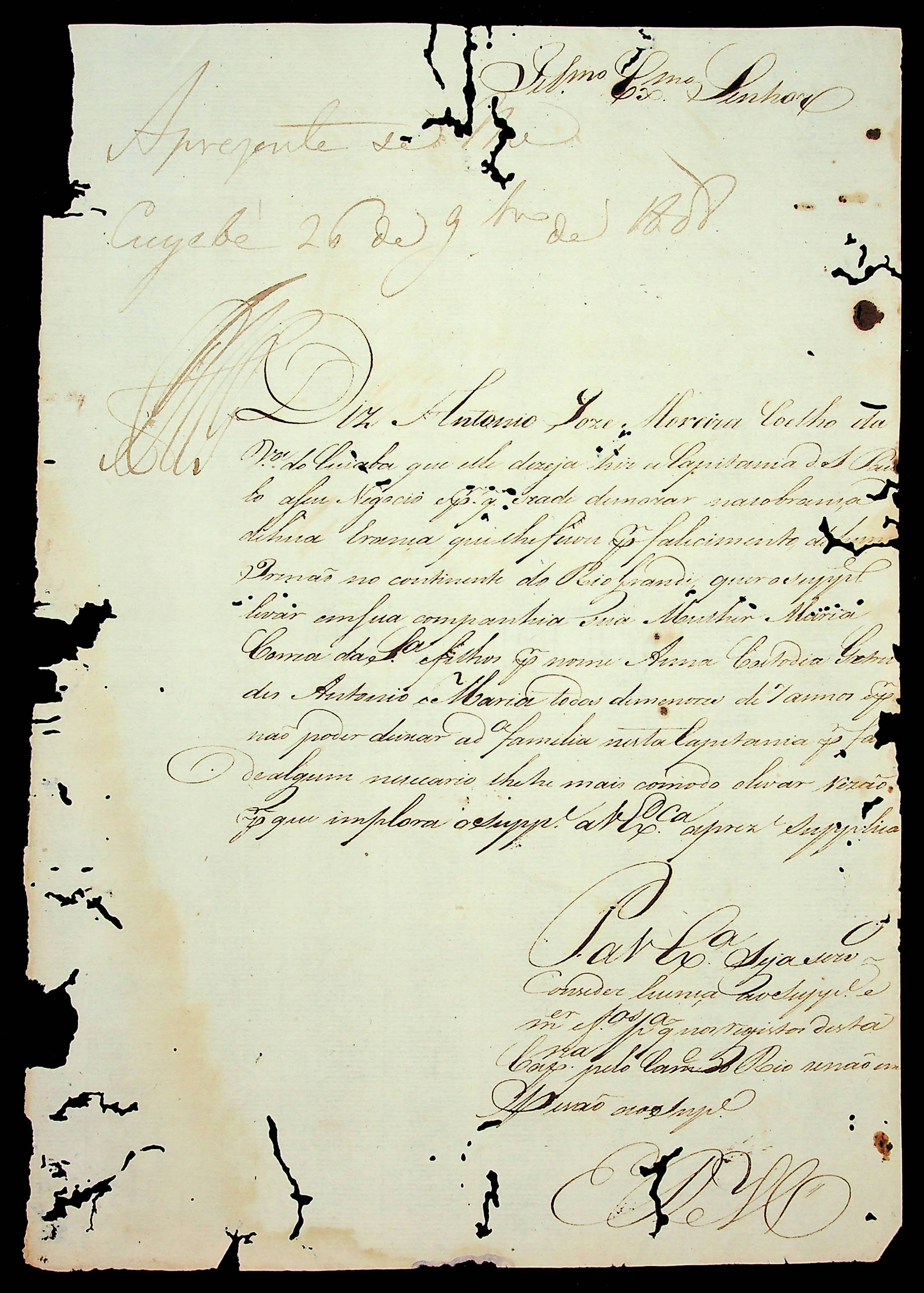 REQUERIMENTO de Antônio José Moreira Coelho ao [Governador e Capitão-General da Capitania de Mato Grosso João Carlos Augusto D’Oeynhausen e Gravemberg].
