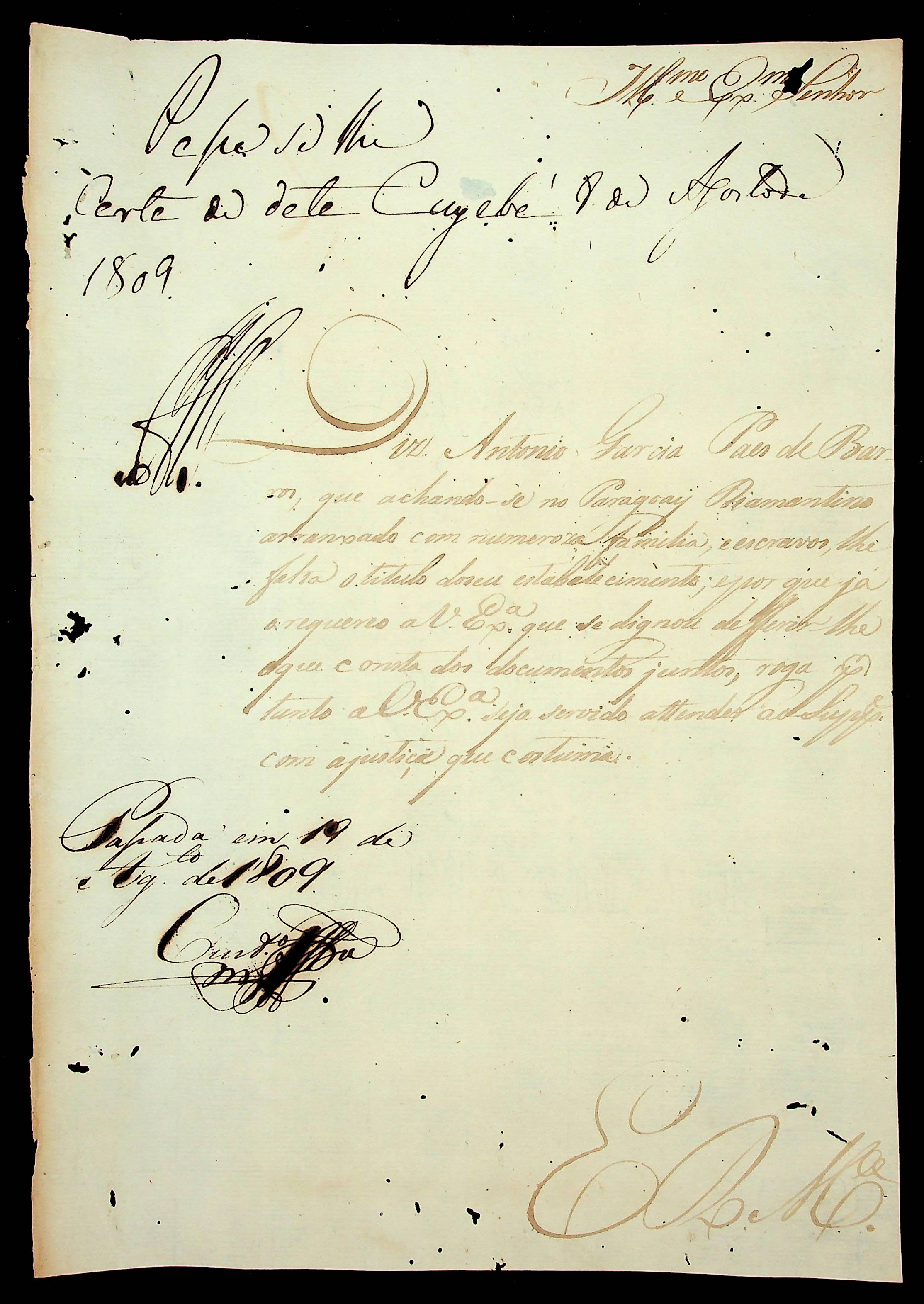 REQUERIMENTO de Antônio Garcia Paes de Barros ao [Governador e Capitão-General da Capitania de Mato Grosso João Carlos Augusto D’Oeynhausen e Gravemberg].