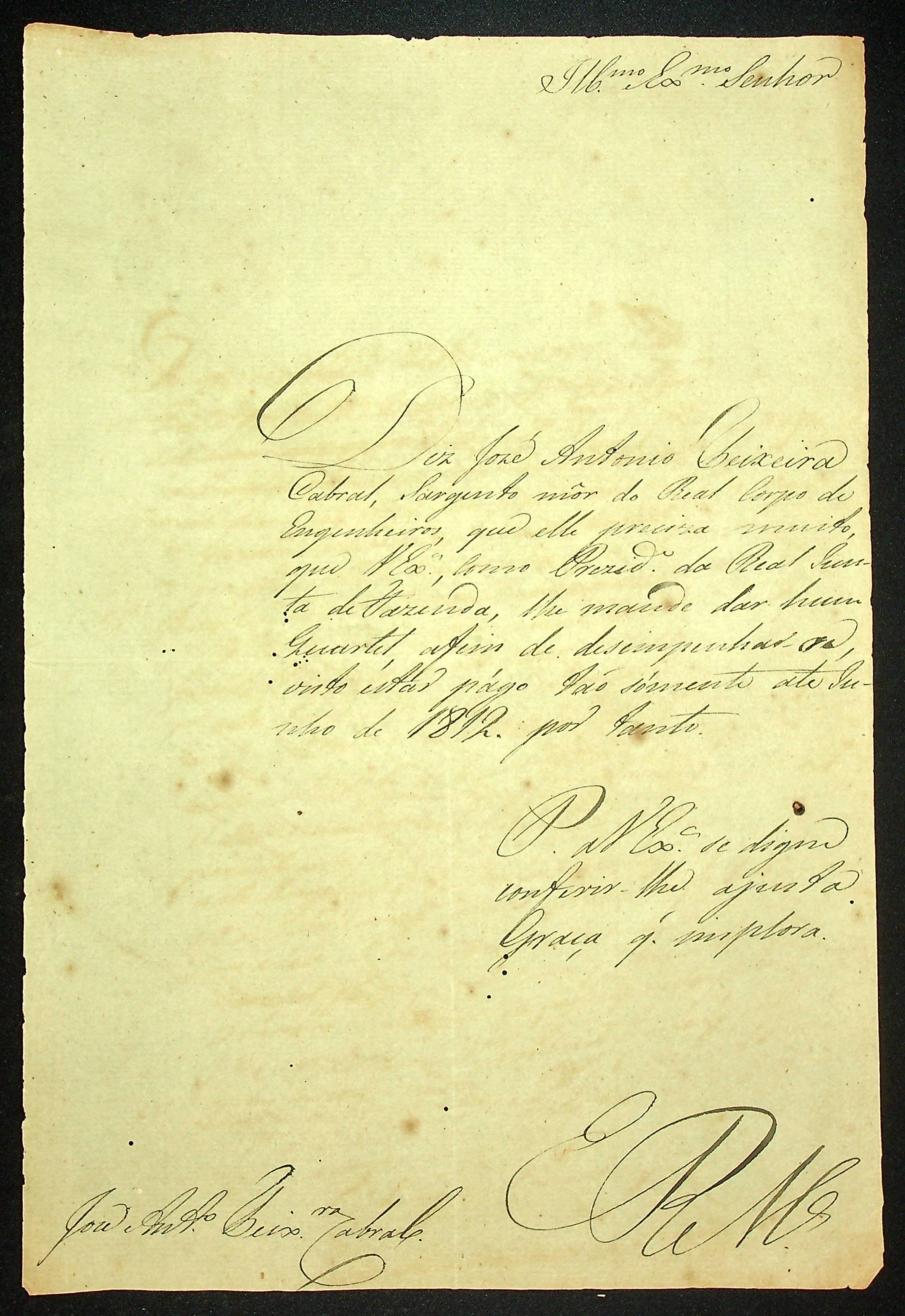 REQUERIMENTO do Sargento-mor Jozé Antônio Teixeira Cabral ao [Governador e Capitão-General da Capitania de Mato Grosso João Carlos Augusto D´Oeynhausen e Gravemberg].