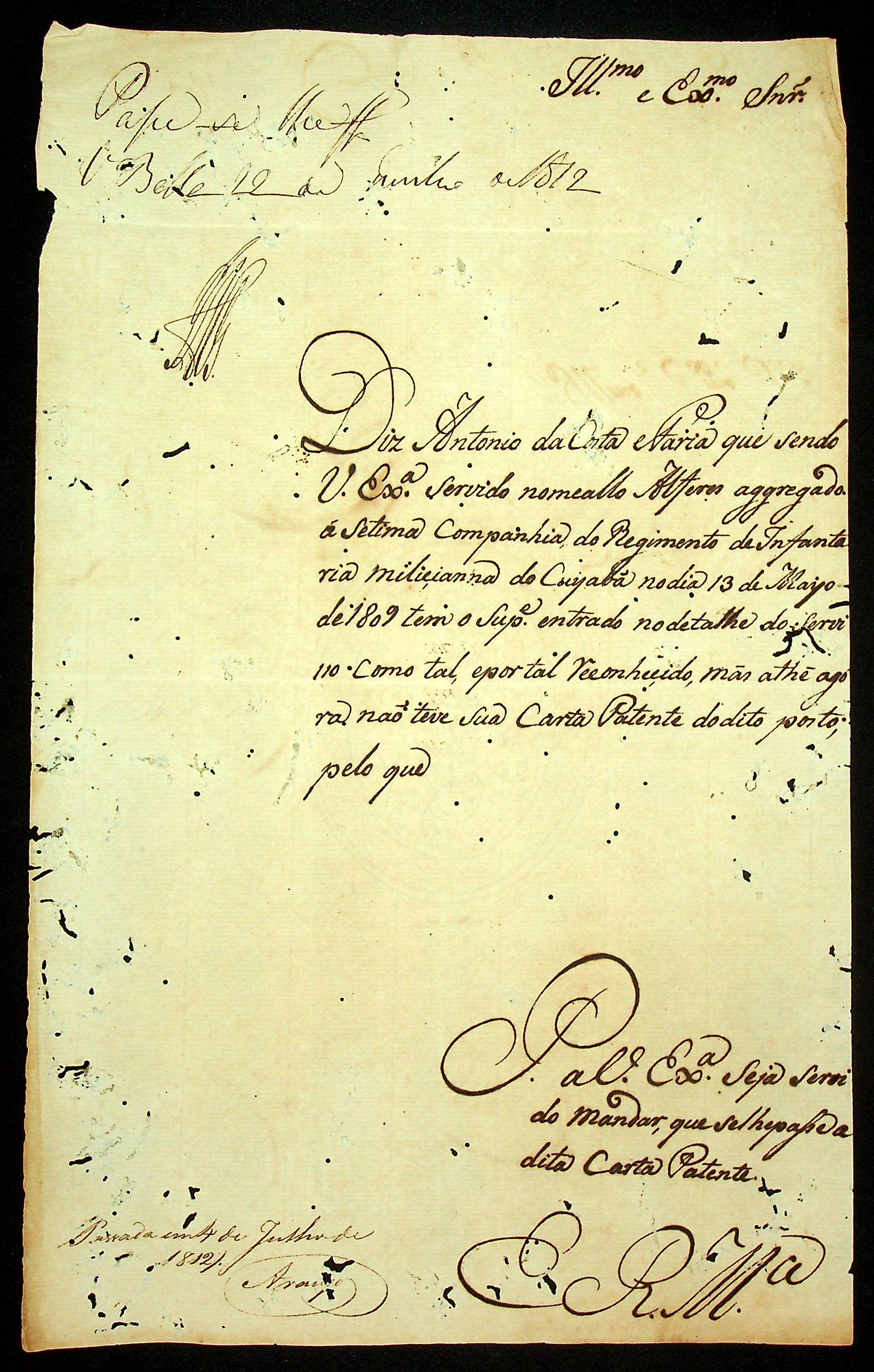 REQUERIMENTO de Antônio da Costa e Faria ao [Governador e Capitão-General da Capitania de Mato Grosso João Carlos Augusto D’Oeynhausen e Gravemberg].