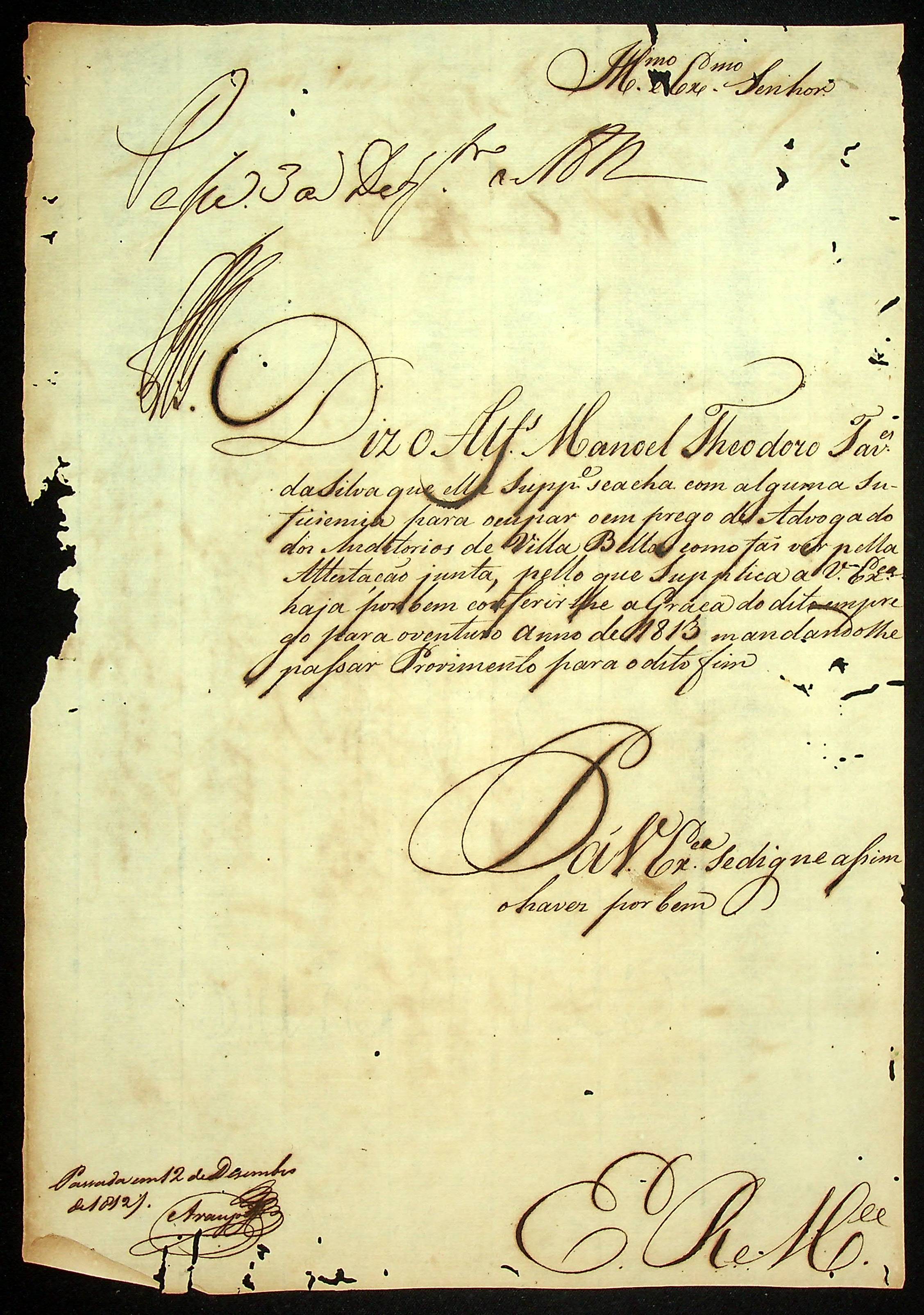 REQUERIMENTO do Alferes Manoel Theodoro Tavares da Silva ao [Governador e Capitão-General da Capitania de Mato Grosso João Carlos Augusto D´Oeynhausen e Gravemberg].