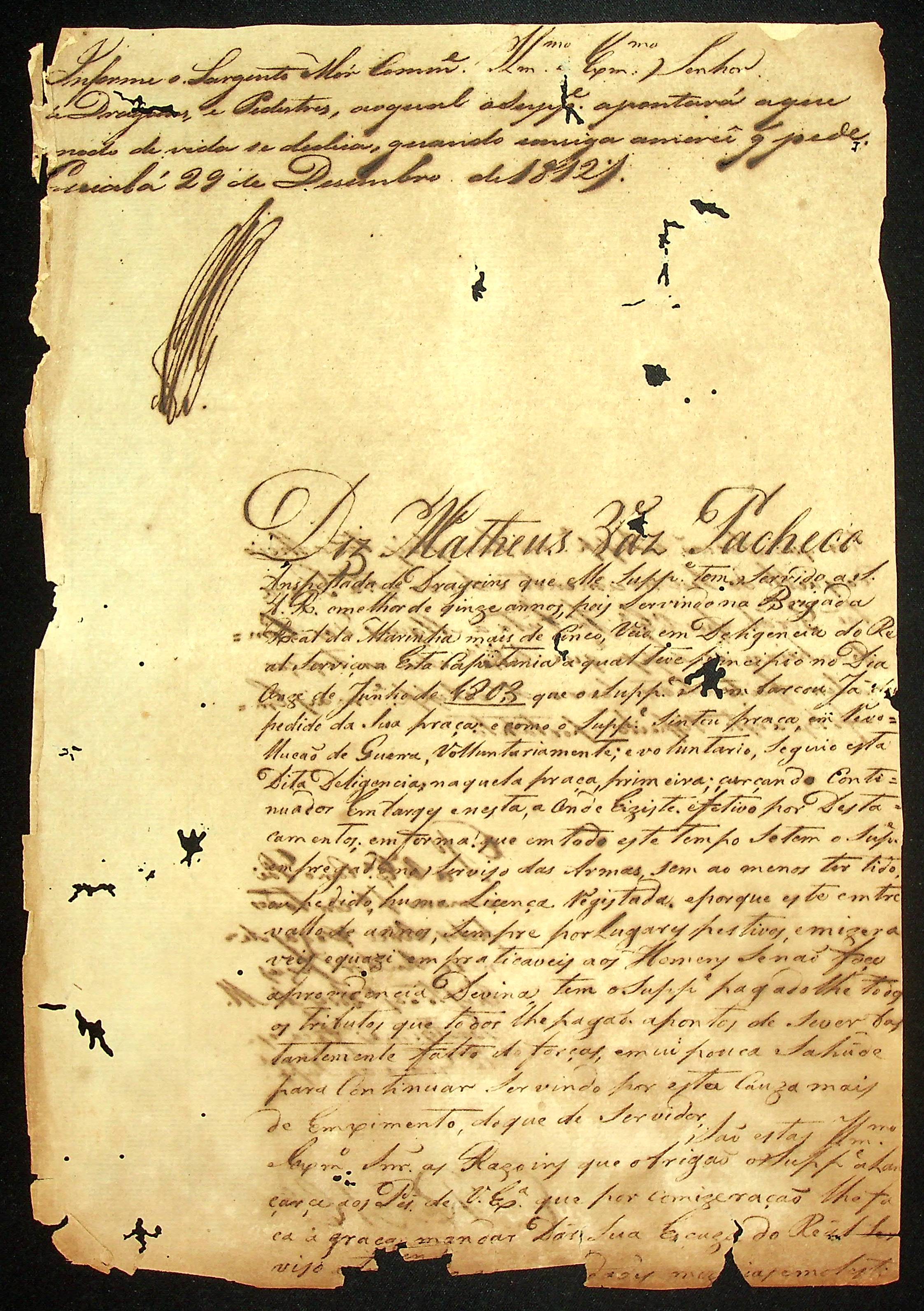 REQUERIMENTO do Anspeçada de Dragões Matheus Vasconcelos Pacheco ao [Governador e Capitão-General da Capitania de Mato Grosso João Carlos Augusto D´Oeynhausen e Gravemberg].