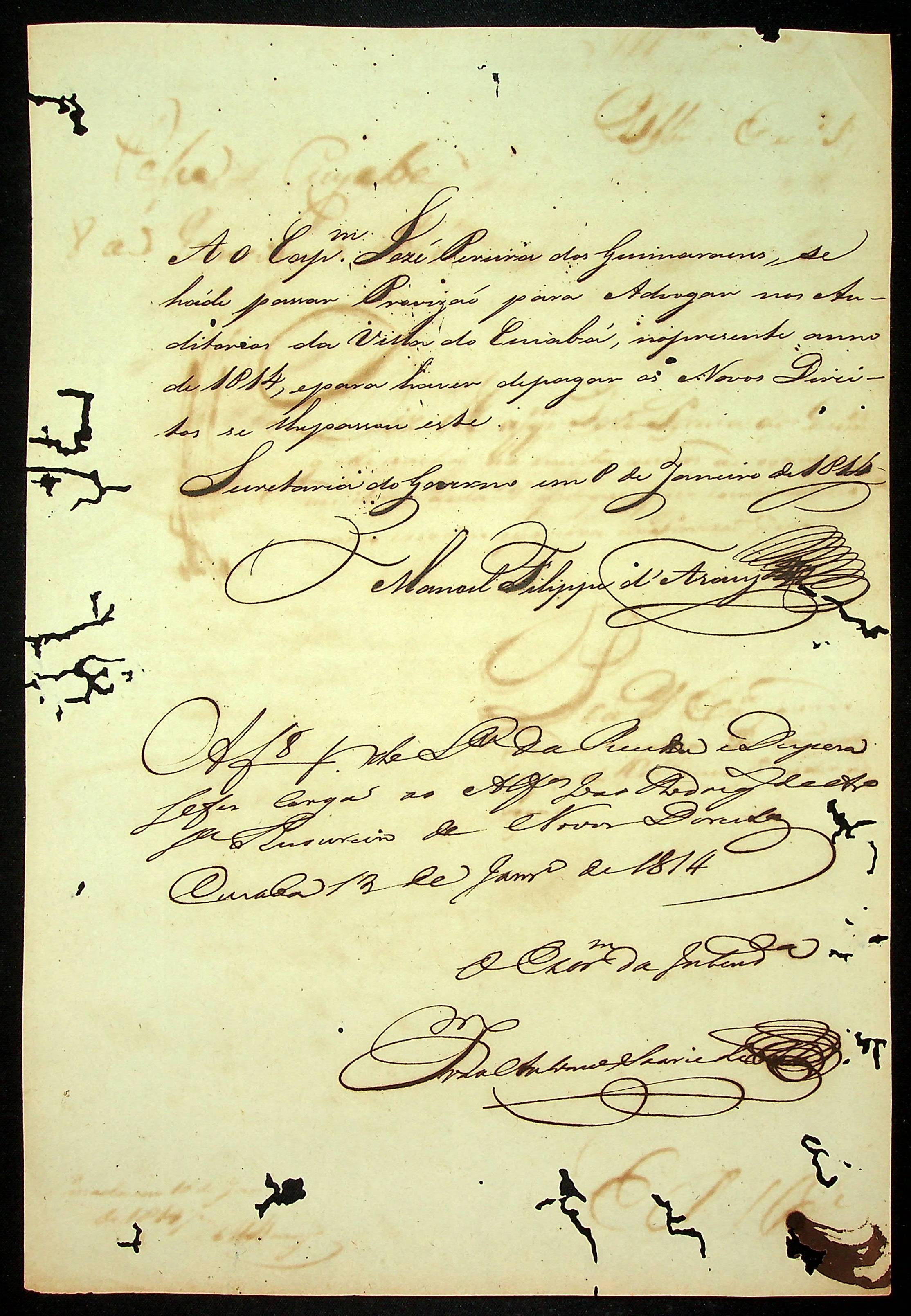 REQUERIMENTO do Capitão José Pereira dos Guimarães ao [Governador e Capitão-General da Capitania de Mato Grosso João Carlos Augusto D´Oeynhausen e Gravemberg].