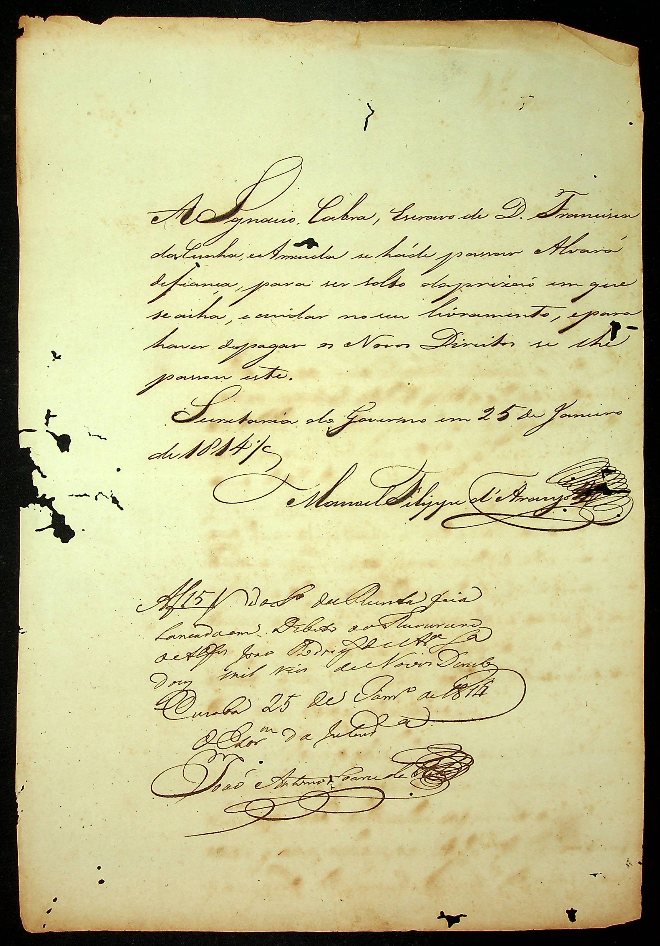 REQUERIMENTO de Francisca da Cunha e Arruda ao [Governador e Capitão-General da Capitania de Mato Grosso João Carlos Augusto D´Oeynhausen e Gravemberg].