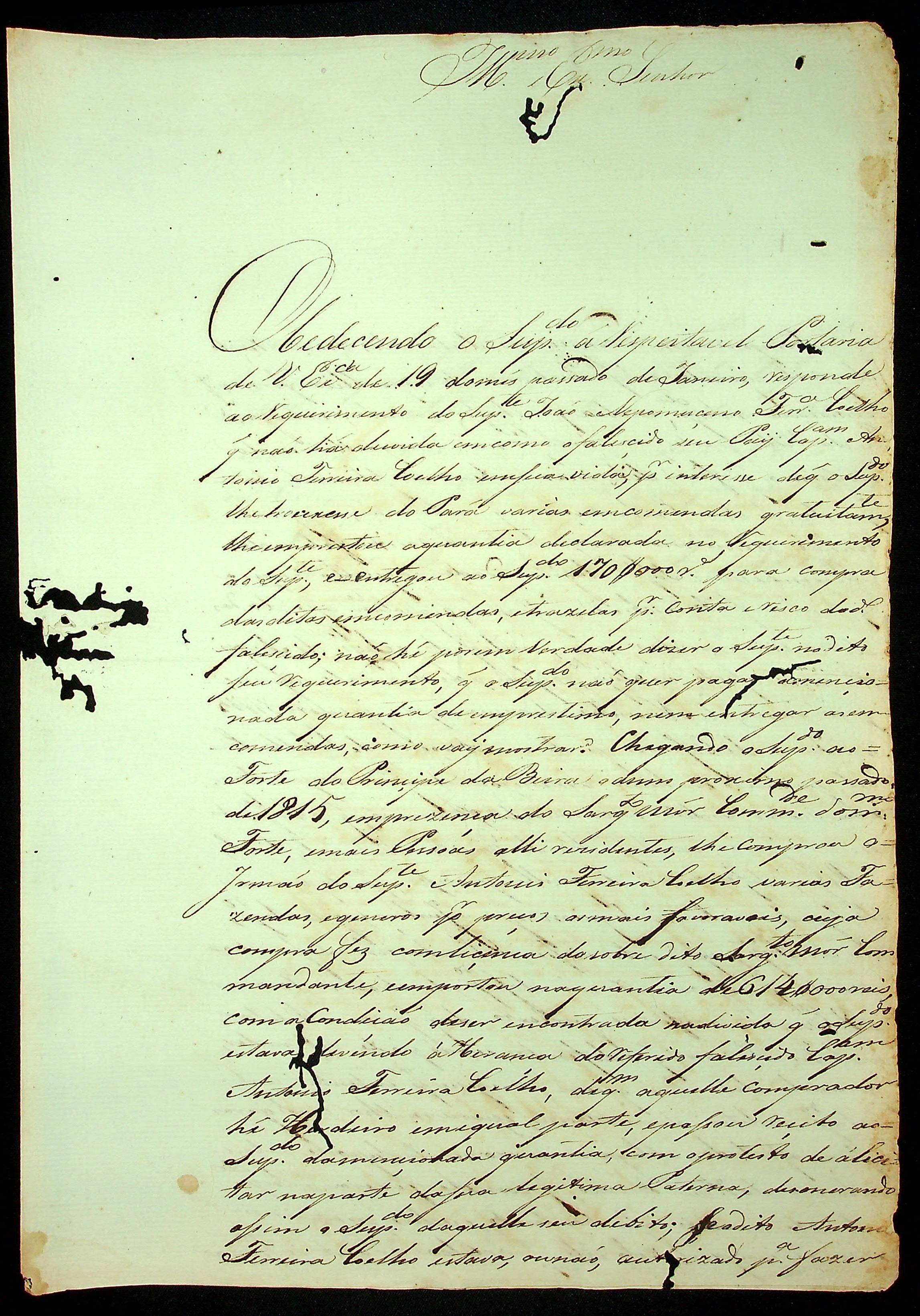 REQUERIMENTO do Soldado Dragão de Vila Bela João Nepomuceno Ferreira Coelho ao [Governador e Capitão-General da Capitania de Mato Grosso João Carlos Augusto D´Oeynhausen e Gravemberg].