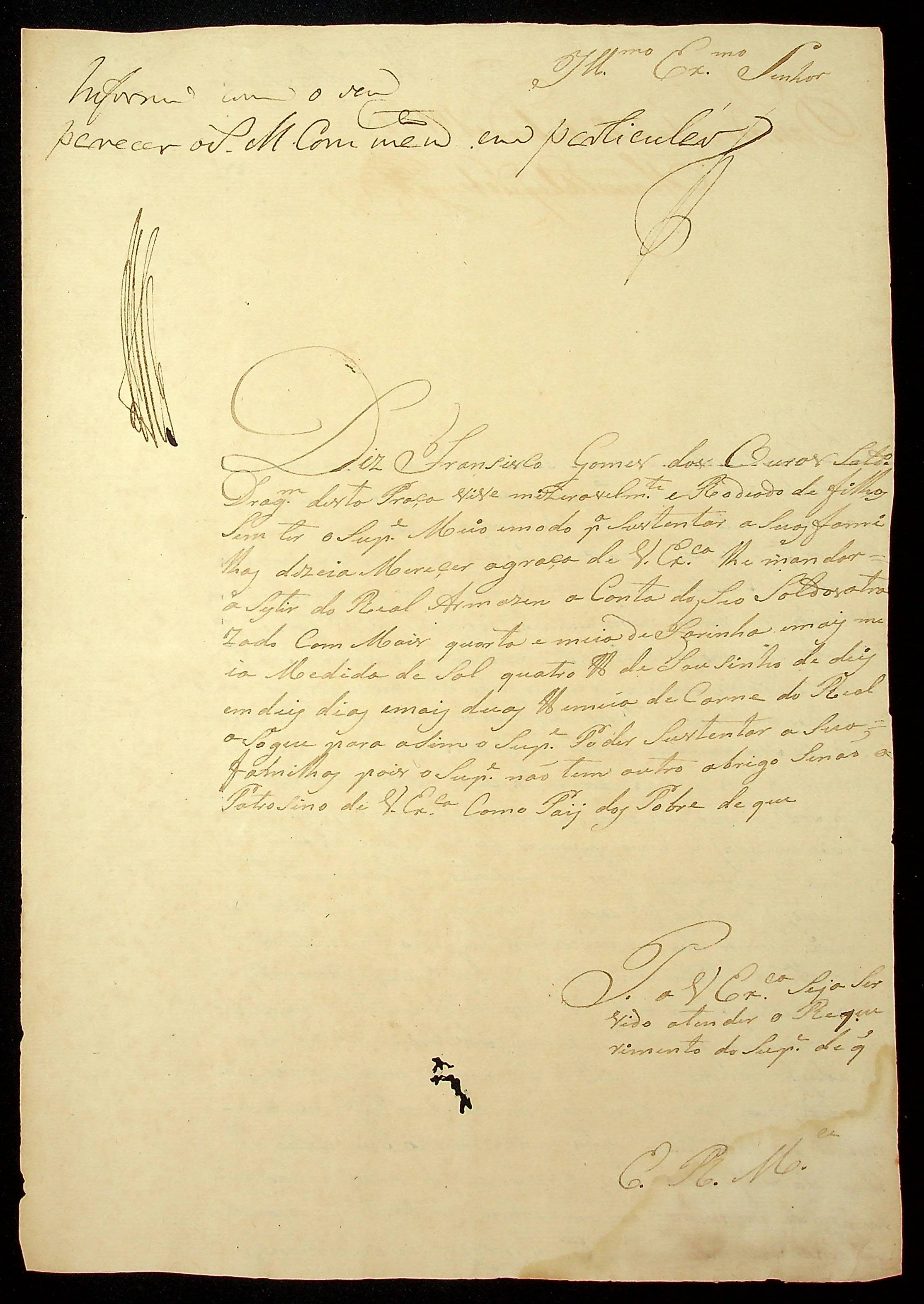 REQUERIMENTO do Soldado Dragão Francisco Gomes dos Ouros ao [Governador e Capitão-General da Capitania de Mato Grosso João Carlos Augusto D´Oeynhausen e Gravemberg].