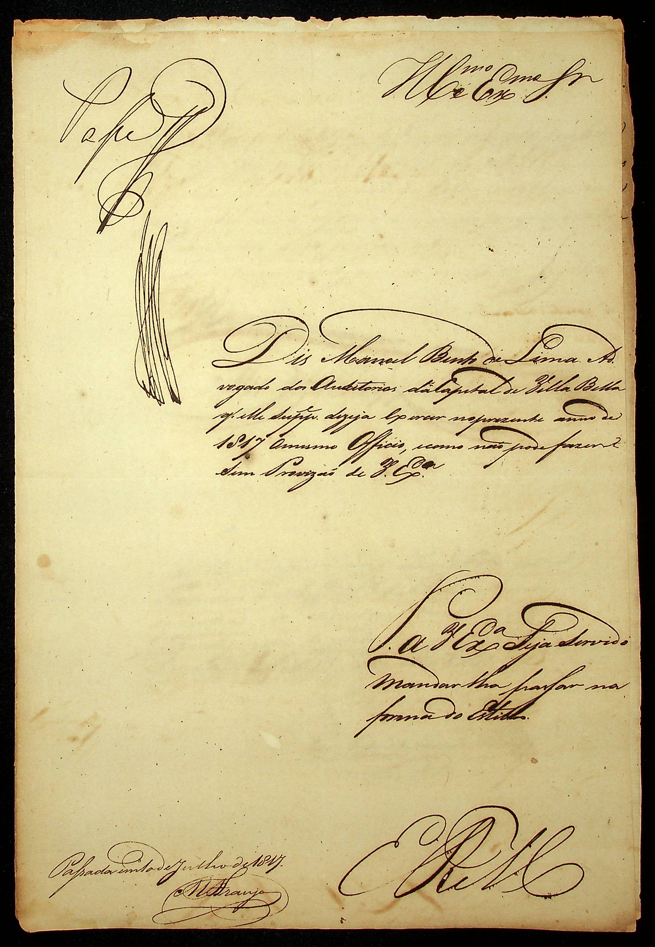 REQUERIMENTO de Manoel Bento de Lima ao [Governador e Capitão-General da Capitania de Mato Grosso João Carlos Augusto D´Oeynhausen e Gravemberg].