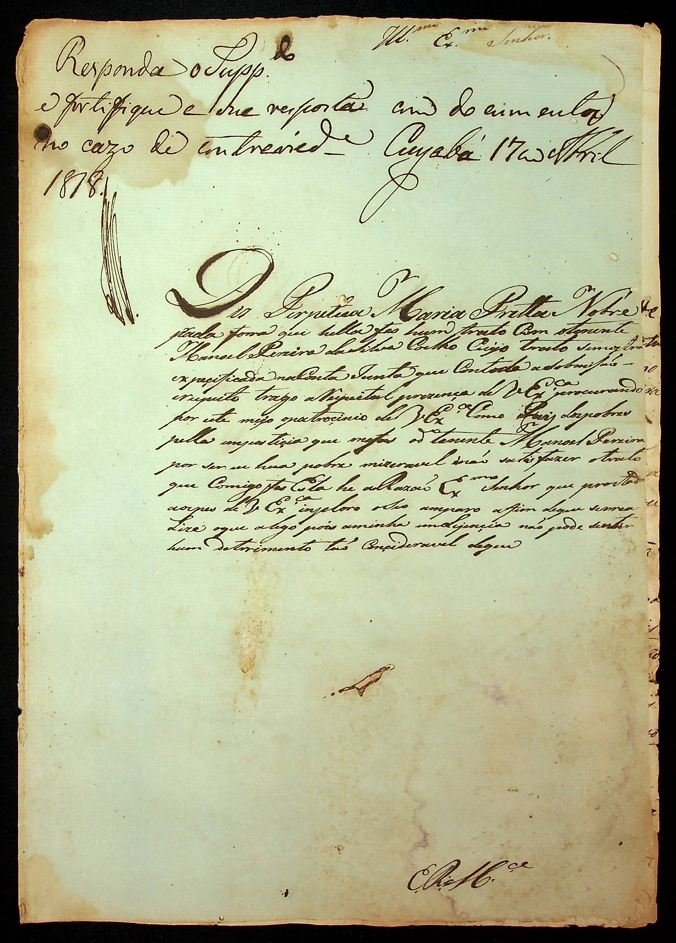 REQUERIMENTO de Perpétua Maria Preta Nobre ao [Governador e Capitão-General da Capitania de Mato Grosso João Carlos Augusto D´Oeynhausen e Gravemberg].