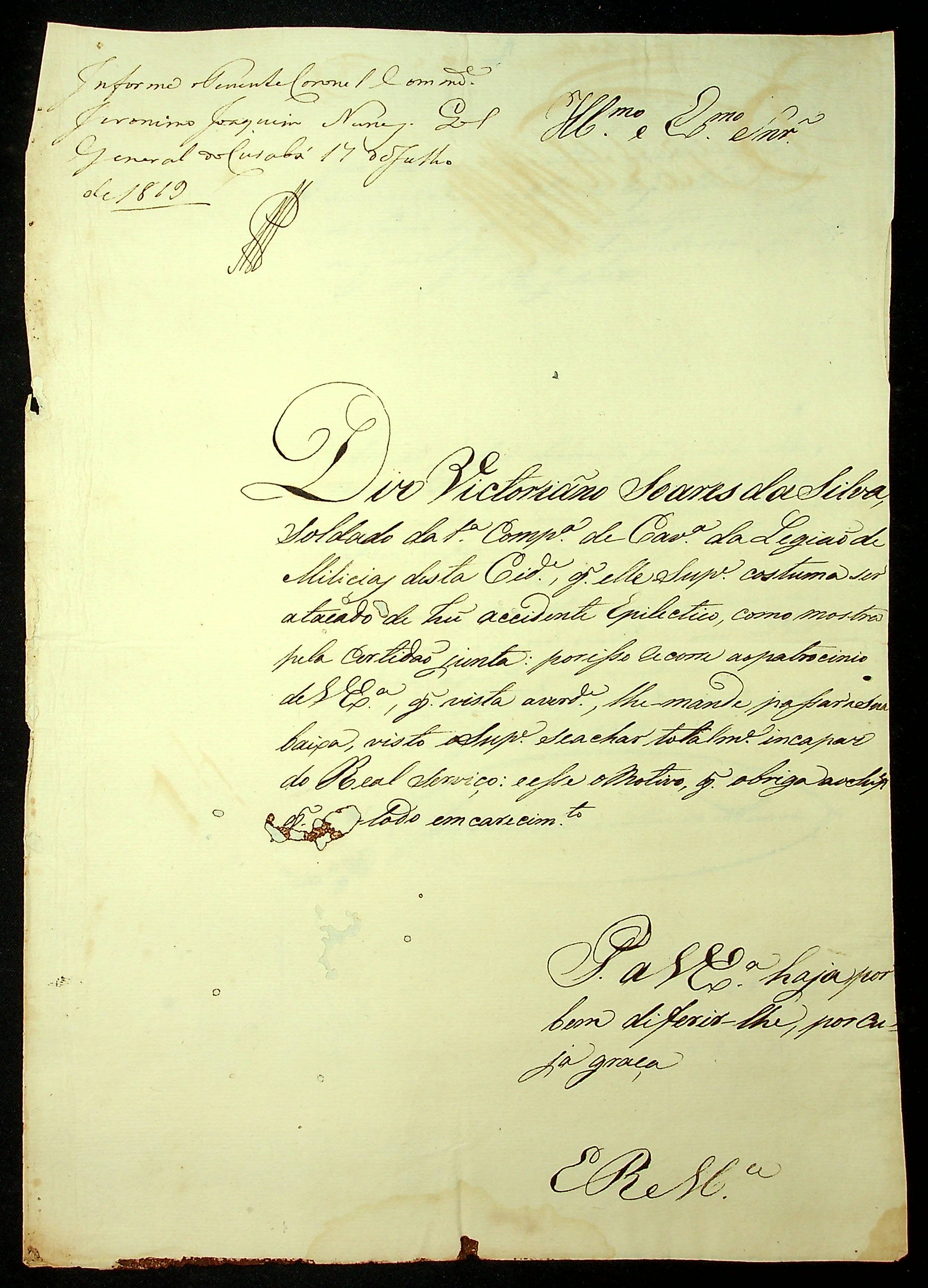 REQUERIMENTO do Soldado da 1ª Companhia da cavalaria da legião de Milicia Victoriano Soares da Silva ao [Governador e Capitão General da Capitania de Mato Grosso Francisco de Paula Magessi Tavares de Carvalho.]
