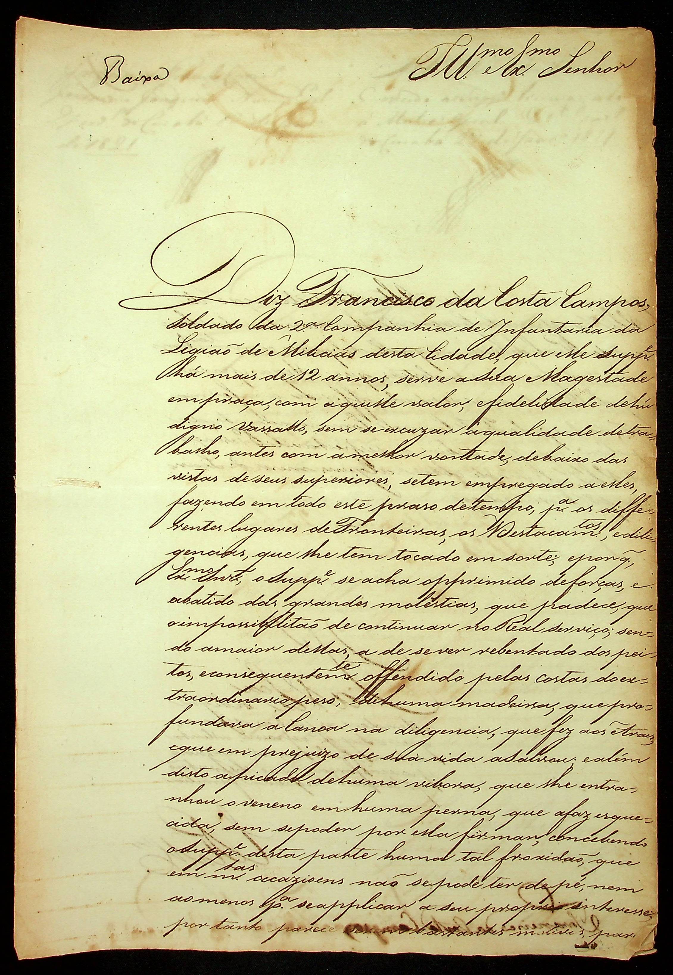 REQUERIMENTO do Soldado da 2ª Infantaria da Companhia de Milicias Francisco da Costa Campos ao [Governador e Capitão General da Capitania de Mato Grosso Francisco de Paula Magessi Tavares de Carvalho].