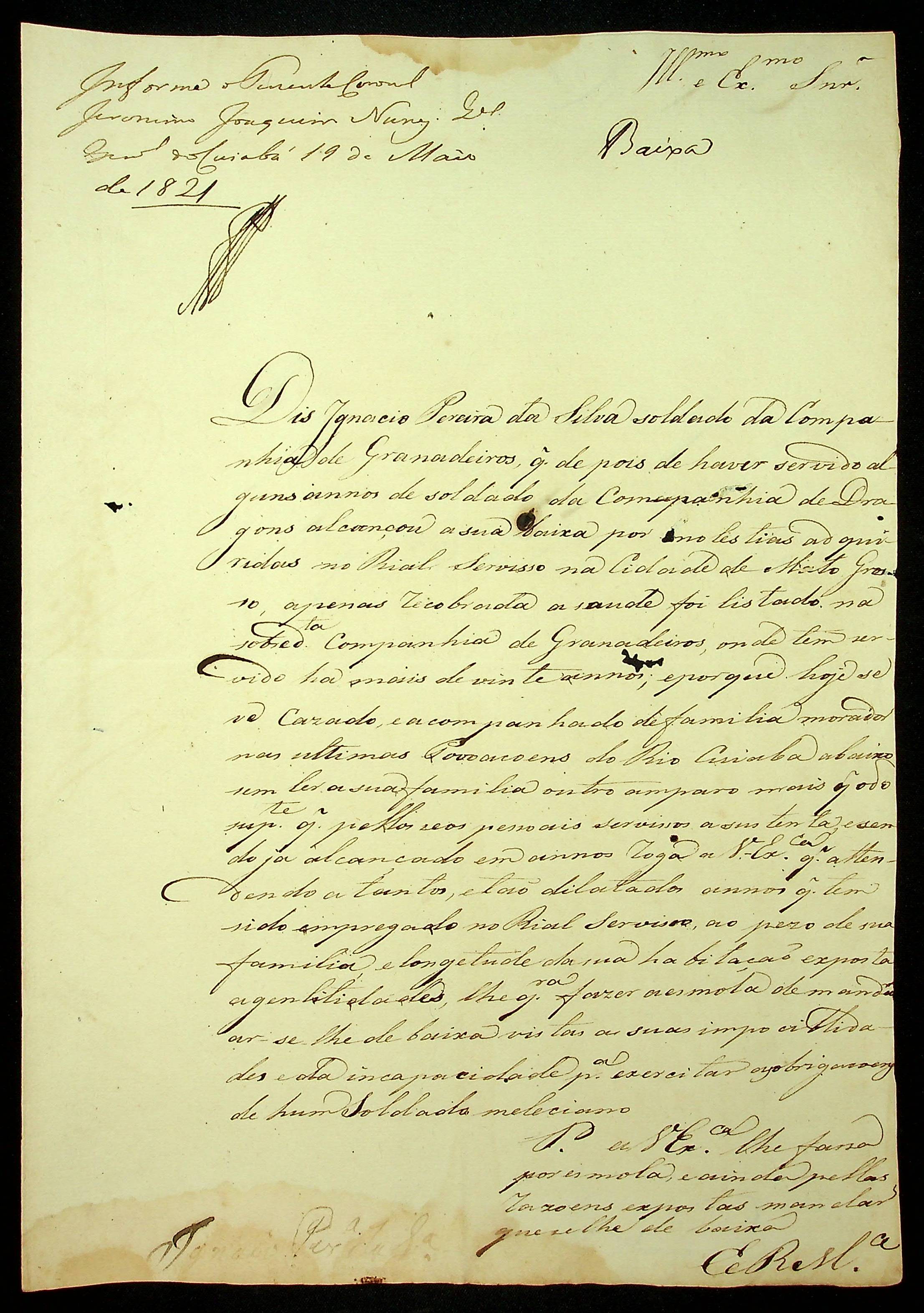 REQUERIMENTO do Soldado da Companhia de Granadeiros Ignácio Pereira da Silva ao [Governador e Capitão General da Capitania de Mato Grosso Francisco de Paula Magessi Tavares de Carvalho].