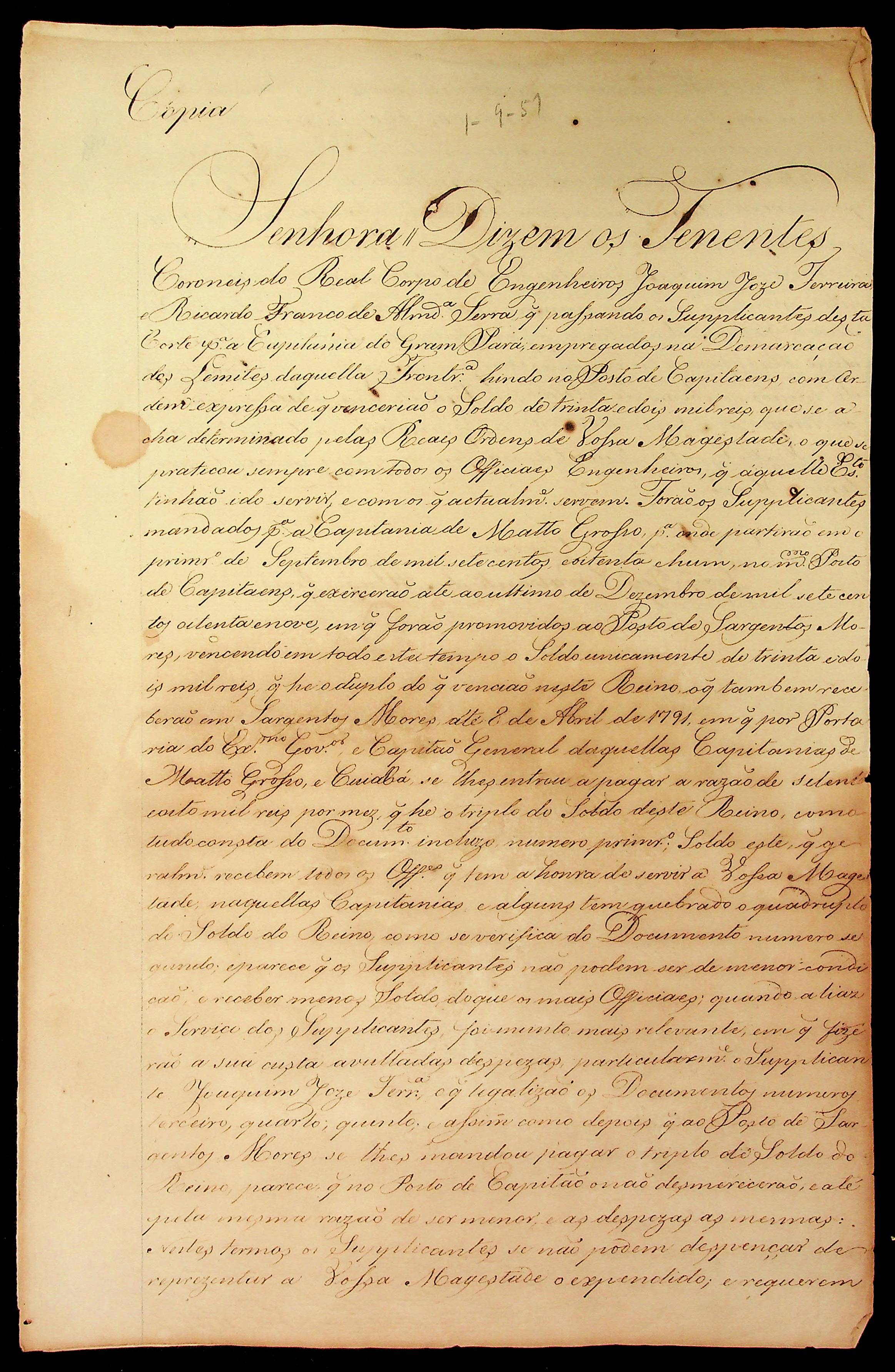 REQUERIMENTO (cópia) dos tenentes coronéis do Real Corpo de Engenheiros Joaquim José Ferreira e Ricardo Franco de Almeida Serra, solicitando aumento de soldo à Rainha.
