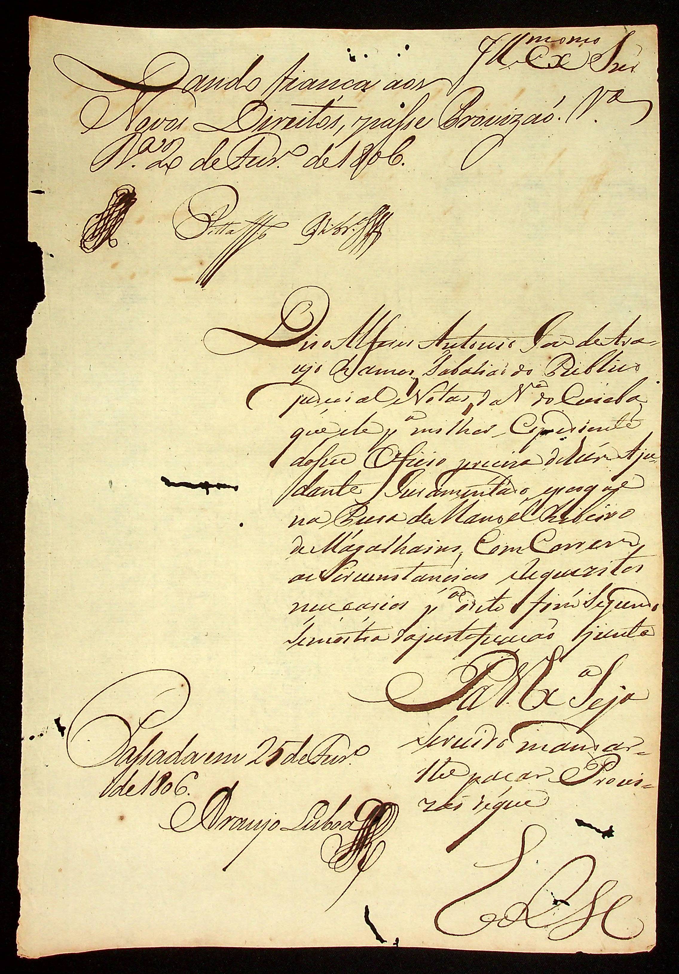 REQUERIMENTO do Alferes e Tabelião Público de Notas Antônio José de Araújo à [Terceira Junta Governativa da Capitania de Mato Grosso].